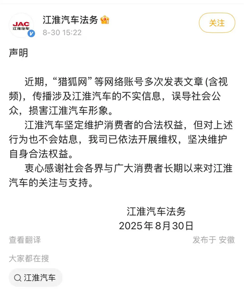 而在前一天的8月30日,@江淮汽車(chē)法務(wù)發(fā)布聲明:近期,“獵狐網(wǎng)”等網(wǎng)絡(luò)賬號(hào)多次發(fā)表文章(含視頻),傳播涉及江淮汽車(chē)的不實(shí)信息,誤導(dǎo)社會(huì)公眾,損害江淮汽車(chē)形象。江淮汽車(chē)堅(jiān)定維護(hù)消費(fèi)者的合法權(quán)益,但對(duì)上述行為也不會(huì)姑息,我司已依法開(kāi)展維權(quán),堅(jiān)決維護(hù)自身合法權(quán)益。