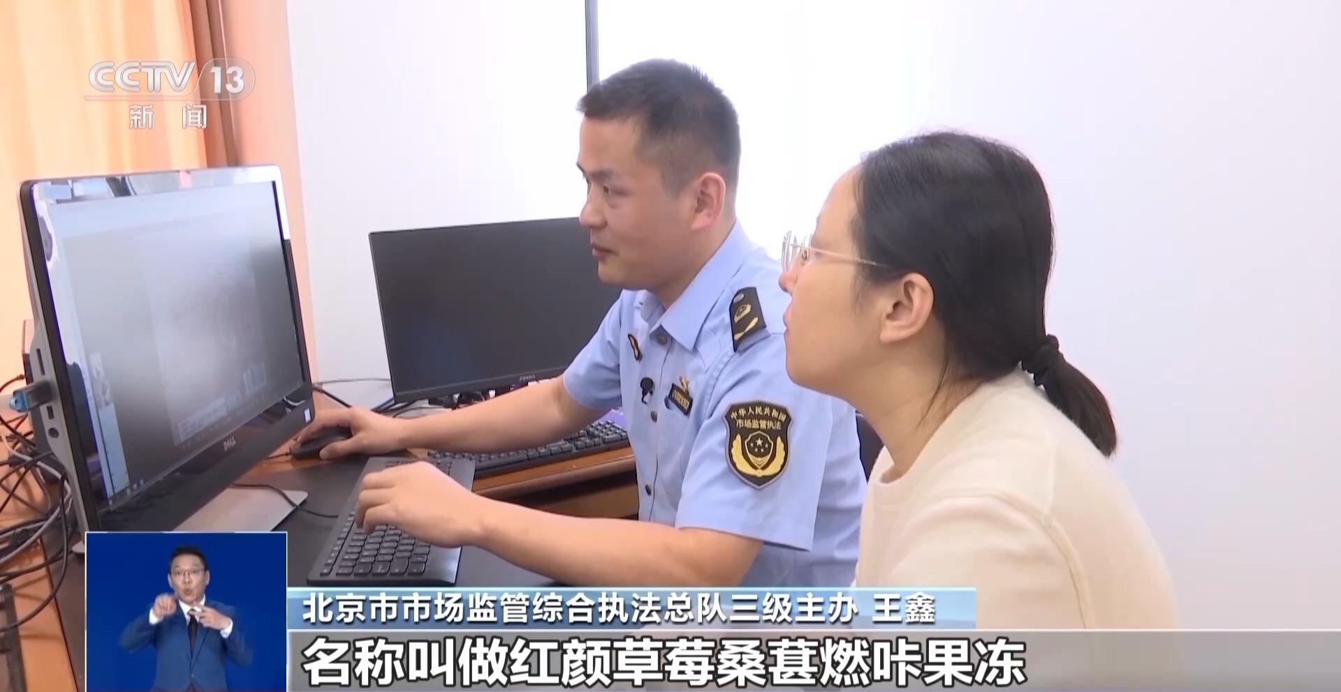 北京市市場監(jiān)管綜合執(zhí)法總隊三級主辦 王鑫:我們可以看到這款產品的名稱叫作紅顏草莓桑葚燃咔果凍,它有食品生產許可證的編號,沒有保健食品的藍帽子標志,也沒有藥品的生產許可證,它只是一款普通的食品。