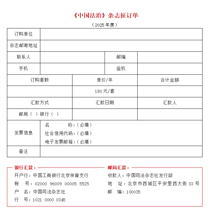 ★若不能進(jìn)行在線提交訂單,請(qǐng)將本征訂單填寫完整后與匯款憑證一并發(fā)郵件至zgfzfxb@moj.gov.cn;或添加微信13671053926后發(fā)送電子版征訂單與匯款憑證。