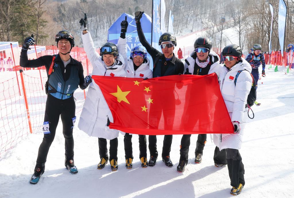 2月12日,中國(guó)隊(duì)選手在滑雪登山混合接力決賽后合影慶祝。新華社記者 楊青 攝
