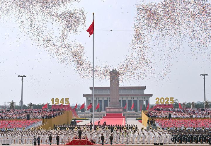 2025年9月3日,紀(jì)念中國人民抗日戰(zhàn)爭(zhēng)暨世界反法西斯戰(zhàn)爭(zhēng)勝利80周年大會(huì)在北京隆重舉行。這是紀(jì)念大會(huì)現(xiàn)場(chǎng)放飛氣球。新華社記者 李賀 攝