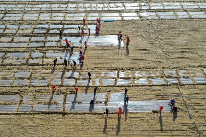 在新疆和田地區(qū)于田縣沙產(chǎn)業(yè)實(shí)驗(yàn)基地,當(dāng)?shù)厝罕娫诜N植薏米(2025年4月8日攝,無(wú)人機(jī)照片)。新華社記者 丁磊 攝