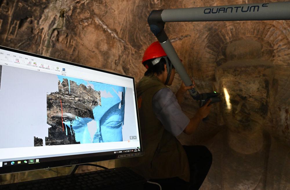 2025年4月9日,武漢大學(xué)文化遺產(chǎn)智能計(jì)算實(shí)驗(yàn)室團(tuán)隊(duì)成員在河南洛陽龍門石窟魏字洞使用關(guān)節(jié)臂掃描儀對佛像進(jìn)行數(shù)字化掃描。從2005年起,龍門石窟研究院開始為龍門石窟建立數(shù)字化檔案,借助激光掃描、高清攝影等技術(shù)手段收集文物數(shù)據(jù),以數(shù)字的形式留存千年石刻群的風(fēng)貌,致力于讓這一規(guī)模宏大、氣勢磅礴的石窟瑰寶“芳華永駐”。