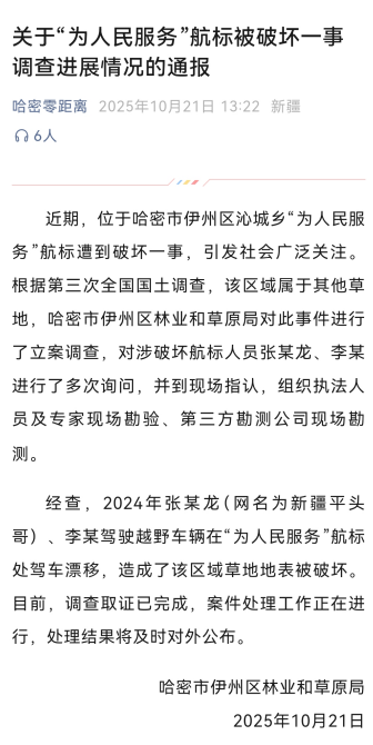 10月21日,新疆哈密市伊州區(qū)林業(yè)和草原局對(duì)外發(fā)布:近期,位于哈密市伊州區(qū)沁城鄉(xiāng)“為人民服務(wù)”航標(biāo)遭到破壞一事,引發(fā)社會(huì)廣泛關(guān)注。根據(jù)第三次全國國土調(diào)查,該區(qū)域?qū)儆谄渌莸?,哈密市伊州區(qū)林業(yè)和草原局對(duì)此事件進(jìn)行了立案調(diào)查,對(duì)涉破壞航標(biāo)人員張某龍、李某進(jìn)行了多次詢問,并到現(xiàn)場指認(rèn),組織執(zhí)法人員及專家現(xiàn)場勘驗(yàn)、第三方勘測公司現(xiàn)場勘測。