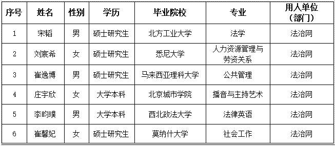 經(jīng)公開招聘,擬錄用以下6人為報(bào)社聘用人員,現(xiàn)將擬錄用人員信息公示如下: