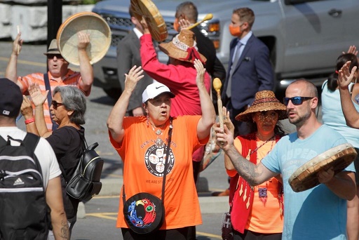 8月10日,在加拿大北溫哥華“圣保羅印第安寄宿學(xué)校”舊址,人們在新聞發(fā)布會后擊鼓、唱歌。加拿大不列顛哥倫比亞省的三個原住民部族10日宣布,將對位于北溫哥華的“圣保羅印第安寄宿學(xué)校”舊址展開調(diào)查。(新華社發(fā),梁森攝)
