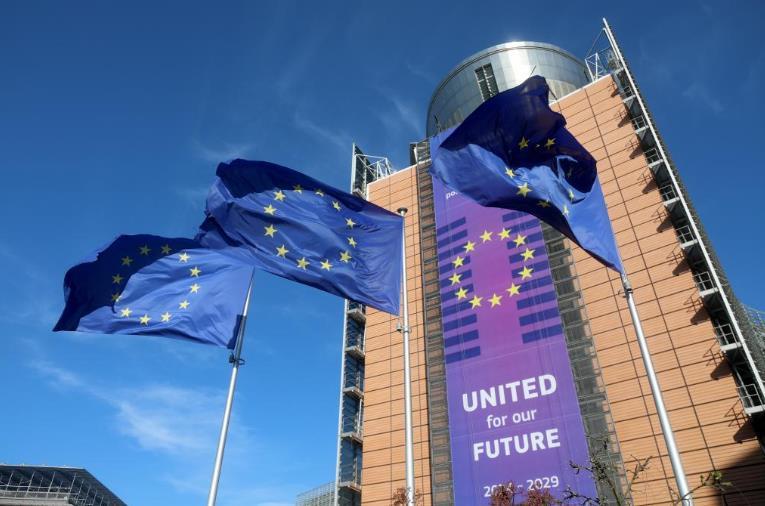 這是4月2日在比利時布魯塞爾歐盟總部外拍攝的歐盟旗幟。新華社記者趙丁喆攝