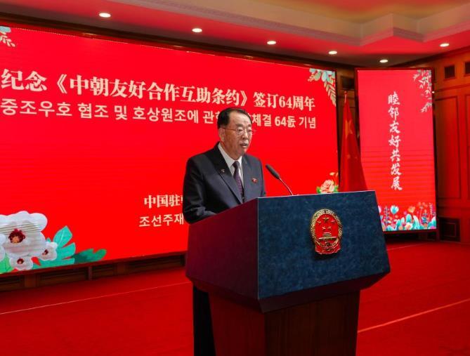 7月9日,在朝鮮首都平壤,朝鮮最高人民會議常任委員會副委員長姜潤石在紀(jì)念《中朝友好合作互助條約》簽訂64周年招待會上致辭。新華社發(fā)(中國駐朝鮮大使館供圖)