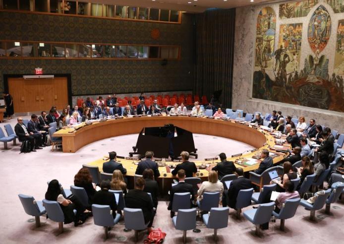 這是7月16日在位于紐約的聯(lián)合國總部拍攝的安理會加沙人道局勢緊急公開會現(xiàn)場。新華社記者 謝鍔 攝