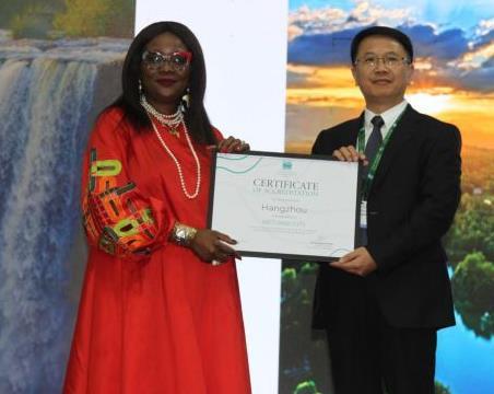 7月24日,在津巴布韋維多利亞瀑布城開幕的《濕地公約》第十五屆締約方大會上,《濕地公約》秘書長穆松達·蒙巴為中國浙江杭州代表頒發(fā)“國際濕地城市”證書。新華社發(fā)(塔法拉攝)