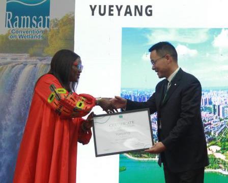 7月24日,在津巴布韋維多利亞瀑布城開幕的《濕地公約》第十五屆締約方大會上,《濕地公約》秘書長穆松達·蒙巴為中國湖南岳陽代表頒發(fā)“國際濕地城市”證書。新華社發(fā)(塔法拉攝)