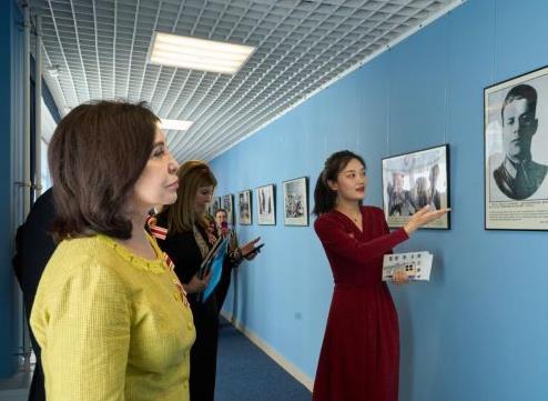 9月2日,在俄羅斯符拉迪沃斯托克舉辦的“百煉成鋼的真心朋友”——紀(jì)念中國(guó)人民抗日戰(zhàn)爭(zhēng)暨世界反法西斯戰(zhàn)爭(zhēng)勝利80周年圖片展上,老師為學(xué)生講解。新華社發(fā)(郭飛洲攝)