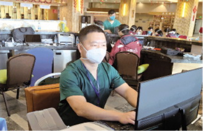 圖為何宗暉在隔離點(diǎn)做信息統(tǒng)計(jì)等工作。
