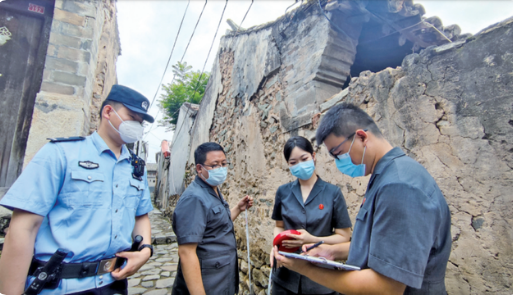 圖為謝耀宗(左二)在村里就一起分家析產(chǎn)案勘察涉案房屋。 受訪者供圖