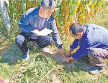 馬建新現(xiàn)場測量土地,調(diào)解田某5兄弟之間土地糾紛。