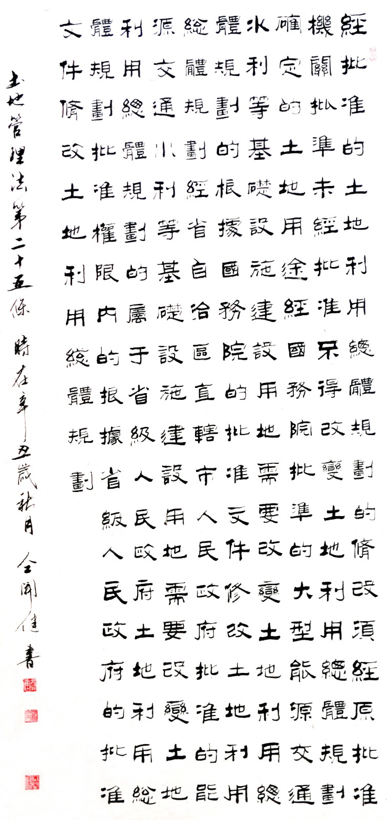 繼1600余位書法家參與書寫《中華人民共和國民法典》全部1260條法條之后,法治日報社聯(lián)合自然資源部法規(guī)司、自然資源部書畫研究會和北京昌平書法家協(xié)會,將筆端對準(zhǔn)土地管理“一法一條例”,即《中華人民共和國土地管理法》和《中華人民共和國土地管理法實施條例》。