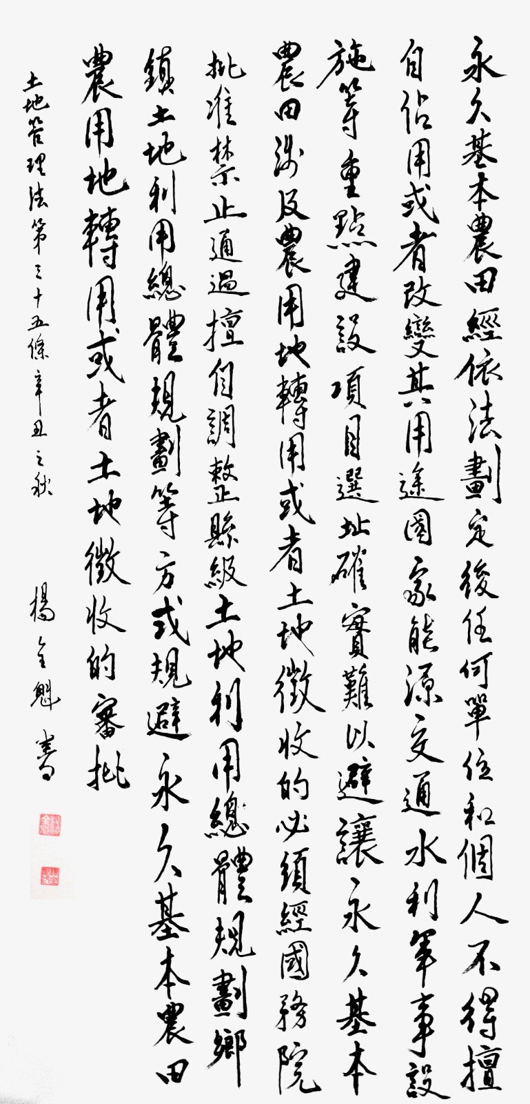 繼1600余位書法家參與書寫《中華人民共和國民法典》全部1260條法條之后,法治日?qǐng)?bào)社聯(lián)合自然資源部法規(guī)司、自然資源部書畫研究會(huì)和北京昌平書法家協(xié)會(huì),將筆端對(duì)準(zhǔn)土地管理“一法一條例”,即《中華人民共和國土地管理法》和《中華人民共和國土地管理法實(shí)施條例》。