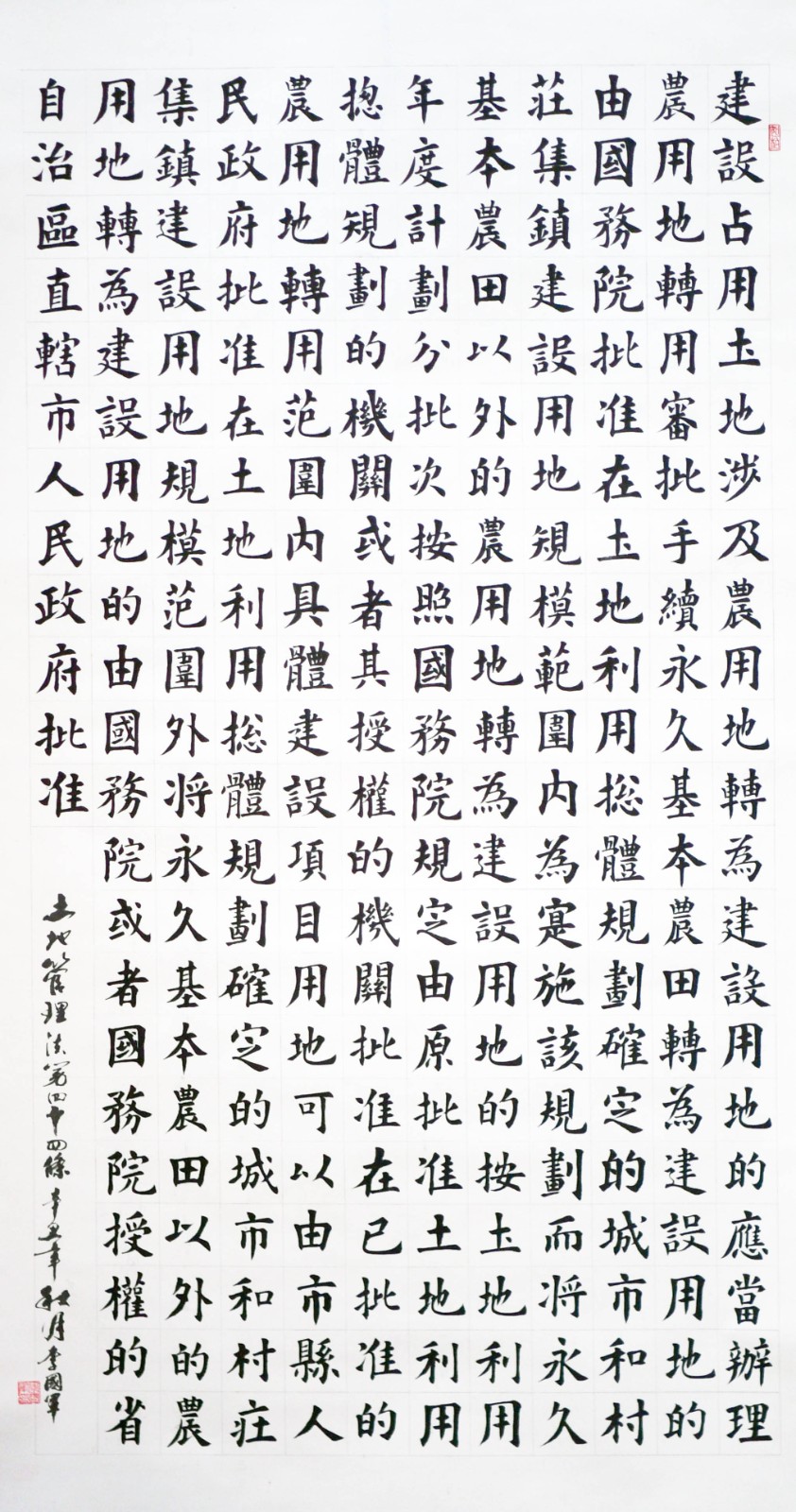 繼1600余位書(shū)法家參與書(shū)寫(xiě)《中華人民共和國(guó)民法典》全部1260條法條之后,法治日?qǐng)?bào)社聯(lián)合自然資源部法規(guī)司、自然資源部書(shū)畫(huà)研究會(huì)和北京昌平書(shū)法家協(xié)會(huì),將筆端對(duì)準(zhǔn)土地管理“一法一條例”,即《中華人民共和國(guó)土地管理法》和《中華人民共和國(guó)土地管理法實(shí)施條例》。