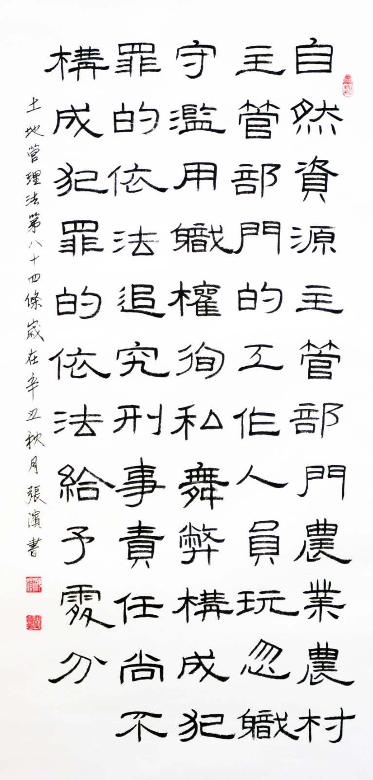 繼1600余位書法家參與書寫《中華人民共和國民法典》全部1260條法條之后,法治日報社聯(lián)合自然資源部法規(guī)司、自然資源部書畫研究會和北京昌平書法家協(xié)會,將筆端對準土地管理“一法一條例”,即《中華人民共和國土地管理法》和《中華人民共和國土地管理法實施條例》。