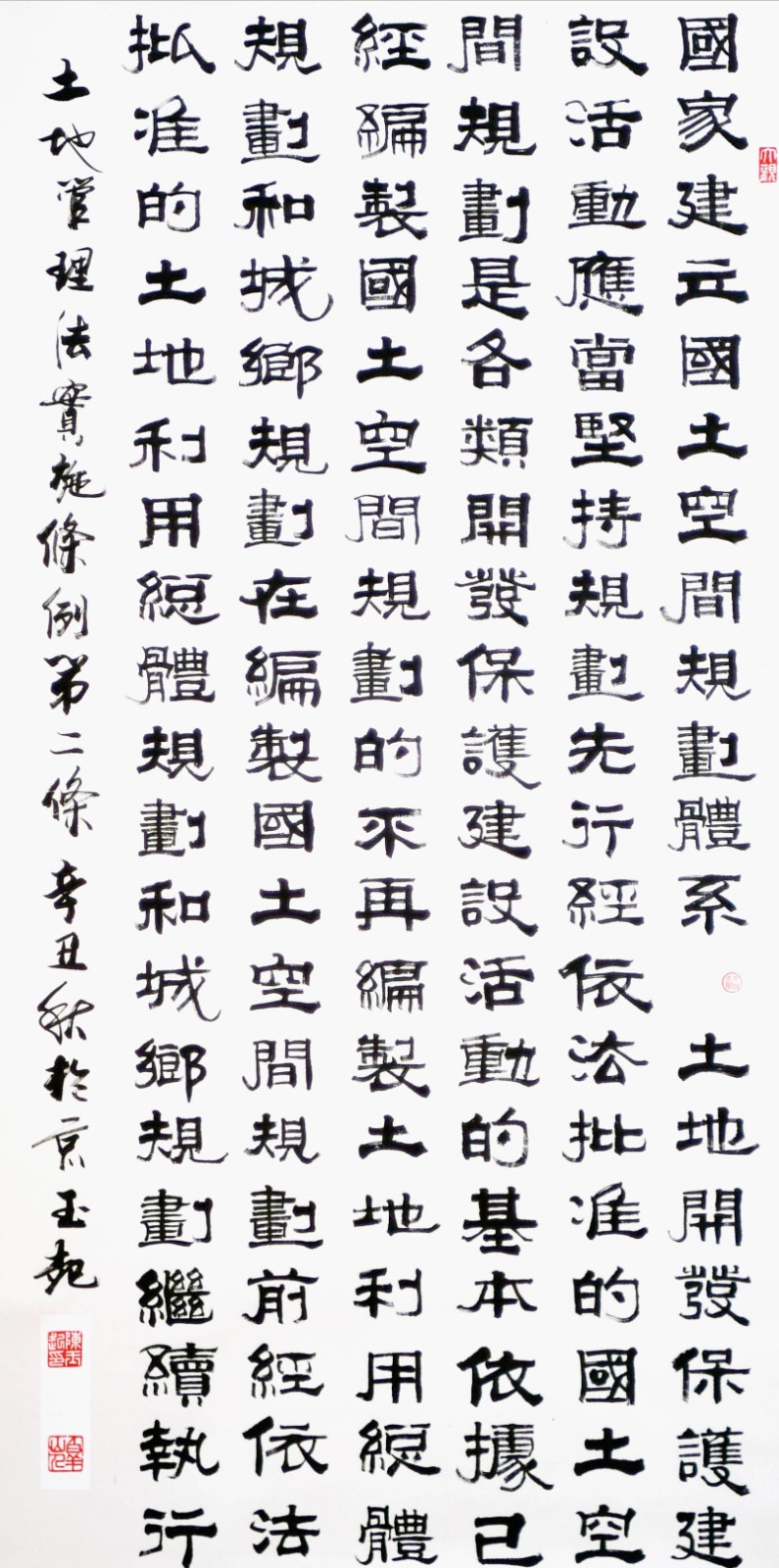 繼1600余位書法家參與書寫《中華人民共和國民法典》全部1260條法條之后,法治日報社聯(lián)合自然資源部法規(guī)司、自然資源部書畫研究會和北京昌平書法家協(xié)會,將筆端對準土地管理“一法一條例”,即《中華人民共和國土地管理法》和《中華人民共和國土地管理法實施條例》。