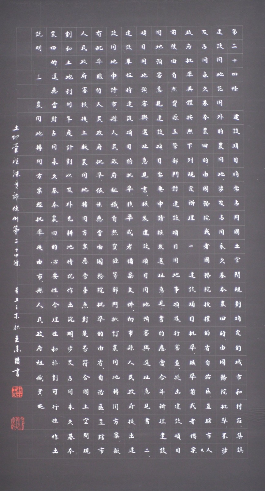 繼1600余位書法家參與書寫《中華人民共和國民法典》全部1260條法條之后,法治日報社聯(lián)合自然資源部法規(guī)司、自然資源部書畫研究會和北京昌平書法家協(xié)會,將筆端對準(zhǔn)土地管理“一法一條例”,即《中華人民共和國土地管理法》和《中華人民共和國土地管理法實施條例》。