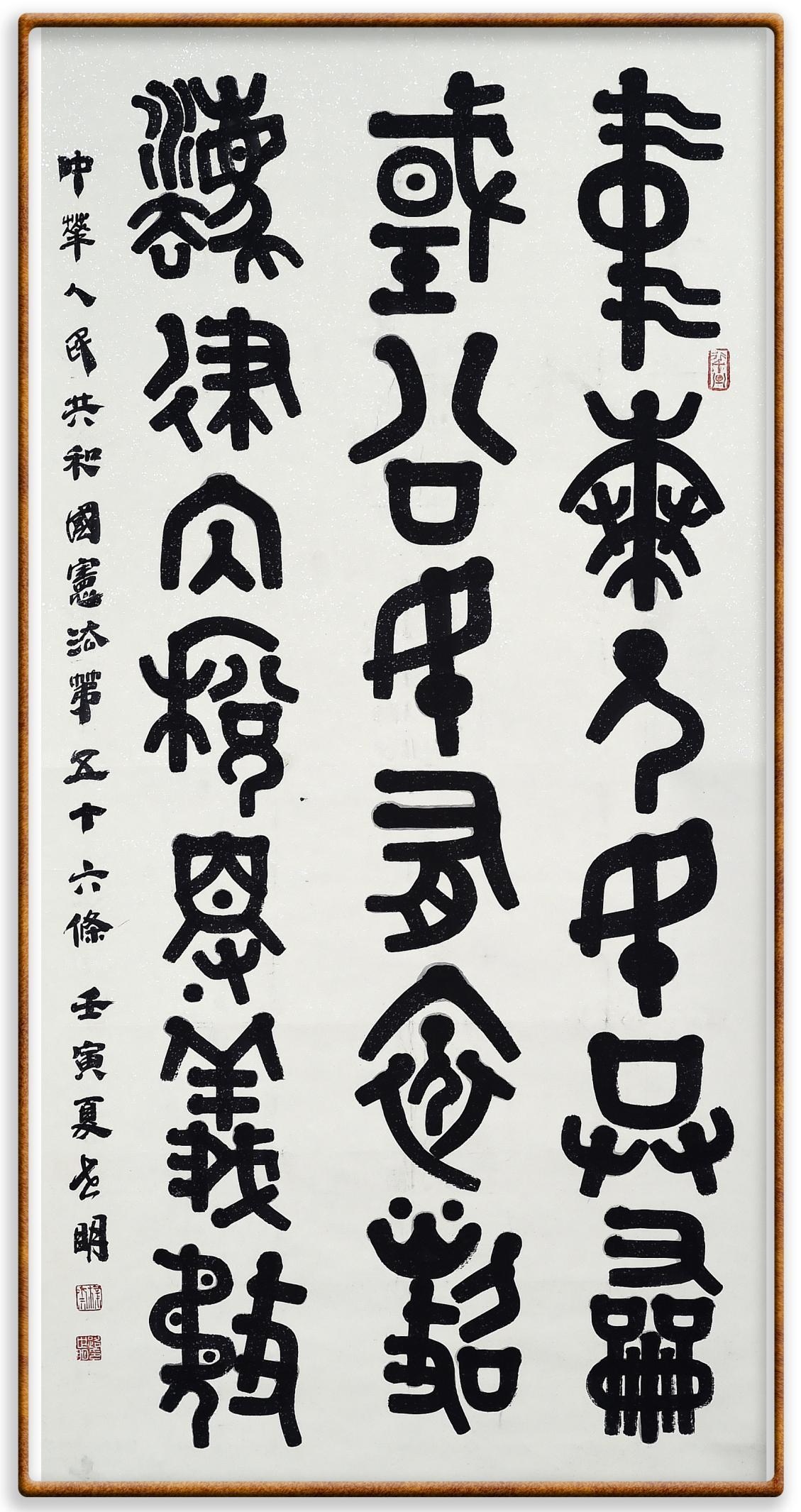 繼《中華人民共和國民法典》《中華人民共和國土地管理法》《中華人民共和國土地管理法實(shí)施條例》《中華人民共和國法律援助法》之后,法治日?qǐng)?bào)社聯(lián)合北京市司法局、北京書法家協(xié)會(huì),將筆端對(duì)準(zhǔn)《中華人民共和國憲法》和《中華人民共和國行政處罰法》。