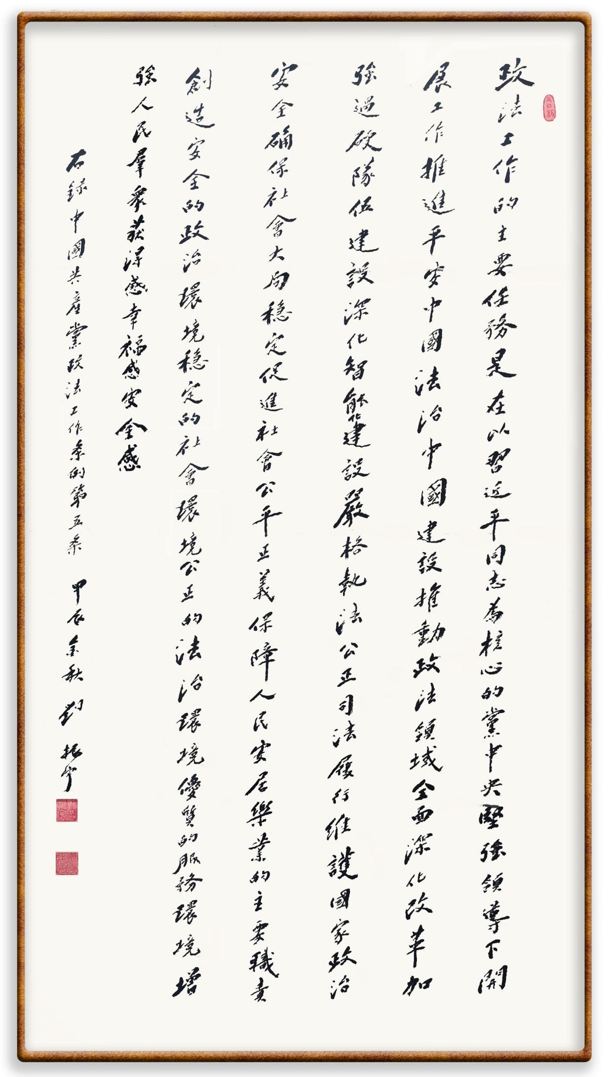 《中國共產(chǎn)黨政法工作條例》對黨領(lǐng)導(dǎo)新時(shí)代政法工作進(jìn)行全面制度擘畫,為黨領(lǐng)導(dǎo)政法工作提供基本遵循,具有重大而深遠(yuǎn)的意義。為學(xué)習(xí)好、宣傳好、貫徹好、實(shí)施好這部黨內(nèi)法規(guī),繼《中華人民共和國民法典》《中華人民共和國憲法》《信訪工作條例》《中華人民共和國澳門特別行政區(qū)基本法》《中華人民共和國香港特別行政區(qū)基本法》等法律法規(guī)之后,“書·法”系列活動將筆端對準(zhǔn)《中國共產(chǎn)黨政法工作條例》。