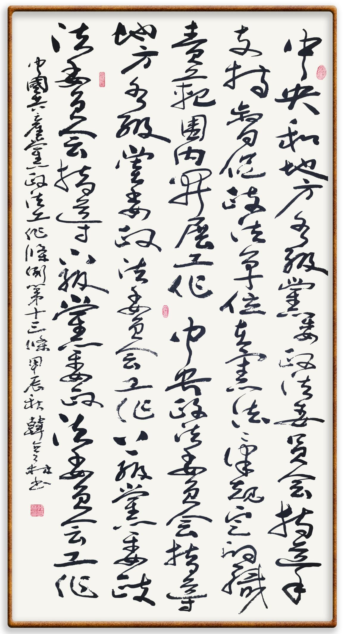 《中國(guó)共產(chǎn)黨政法工作條例》對(duì)黨領(lǐng)導(dǎo)新時(shí)代政法工作進(jìn)行全面制度擘畫,為黨領(lǐng)導(dǎo)政法工作提供基本遵循,具有重大而深遠(yuǎn)的意義。為學(xué)習(xí)好、宣傳好、貫徹好、實(shí)施好這部黨內(nèi)法規(guī),繼《中華人民共和國(guó)民法典》《中華人民共和國(guó)憲法》《信訪工作條例》《中華人民共和國(guó)澳門特別行政區(qū)基本法》《中華人民共和國(guó)香港特別行政區(qū)基本法》等法律法規(guī)之后,“書·法”系列活動(dòng)將筆端對(duì)準(zhǔn)《中國(guó)共產(chǎn)黨政法工作條例》。