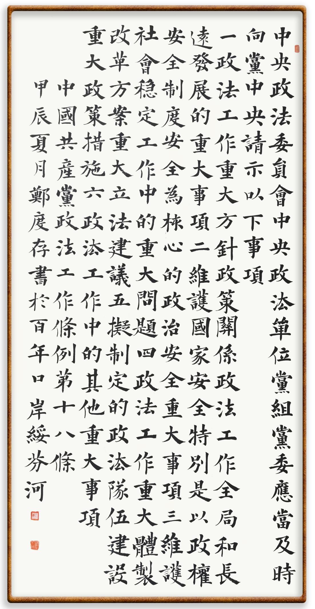 《中國共產(chǎn)黨政法工作條例》對黨領(lǐng)導(dǎo)新時代政法工作進行全面制度擘畫,為黨領(lǐng)導(dǎo)政法工作提供基本遵循,具有重大而深遠(yuǎn)的意義。為學(xué)習(xí)好、宣傳好、貫徹好、實施好這部黨內(nèi)法規(guī),繼《中華人民共和國民法典》《中華人民共和國憲法》《信訪工作條例》《中華人民共和國澳門特別行政區(qū)基本法》《中華人民共和國香港特別行政區(qū)基本法》等法律法規(guī)之后,“書·法”系列活動將筆端對準(zhǔn)《中國共產(chǎn)黨政法工作條例》。
