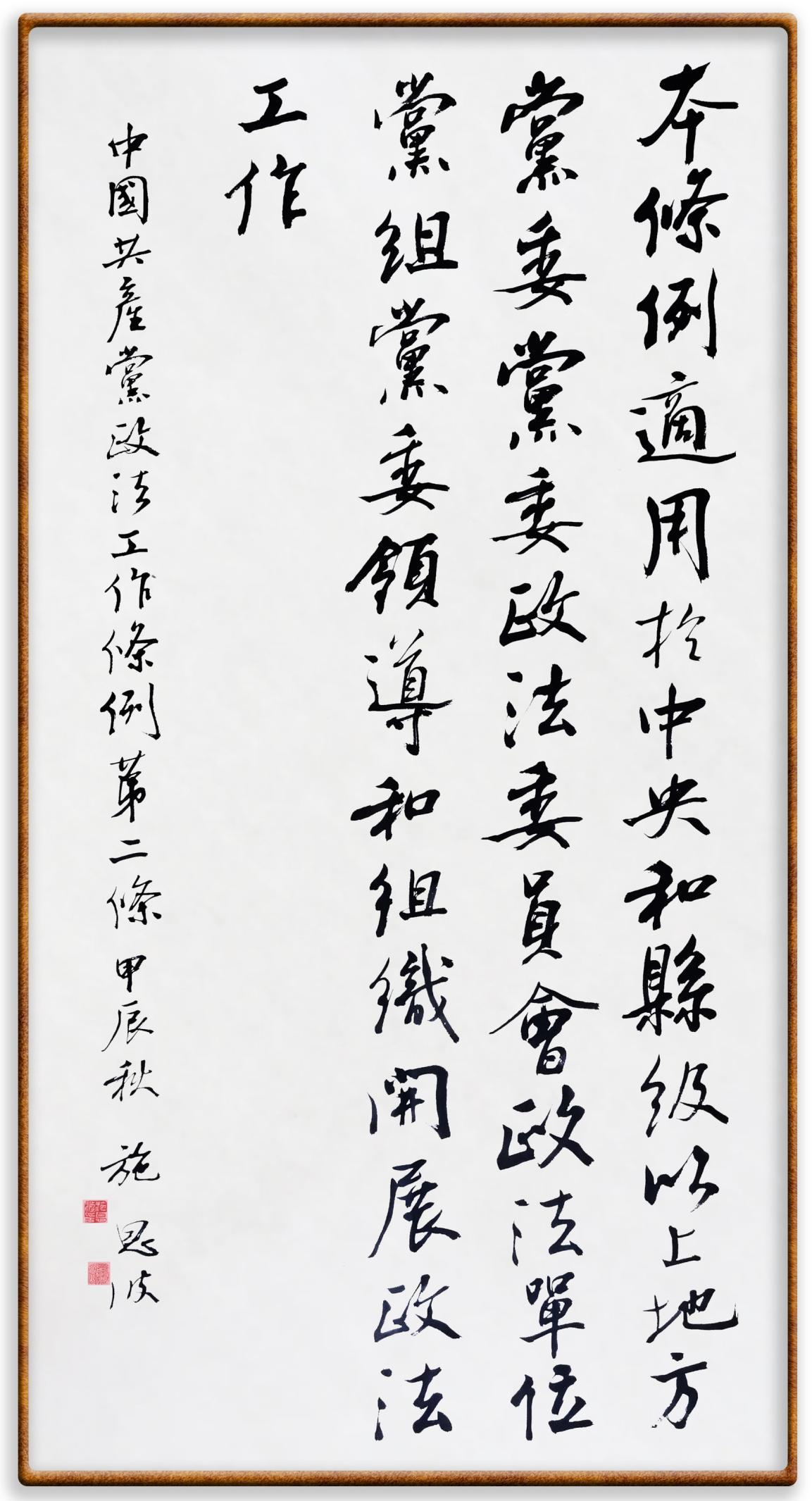 《中國(guó)共產(chǎn)黨政法工作條例》對(duì)黨領(lǐng)導(dǎo)新時(shí)代政法工作進(jìn)行全面制度擘畫,為黨領(lǐng)導(dǎo)政法工作提供基本遵循,具有重大而深遠(yuǎn)的意義。為學(xué)習(xí)好、宣傳好、貫徹好、實(shí)施好這部黨內(nèi)法規(guī),繼《中華人民共和國(guó)民法典》《中華人民共和國(guó)憲法》《信訪工作條例》《中華人民共和國(guó)澳門特別行政區(qū)基本法》《中華人民共和國(guó)香港特別行政區(qū)基本法》等法律法規(guī)之后,“書·法”系列活動(dòng)將筆端對(duì)準(zhǔn)《中國(guó)共產(chǎn)黨政法工作條例》。