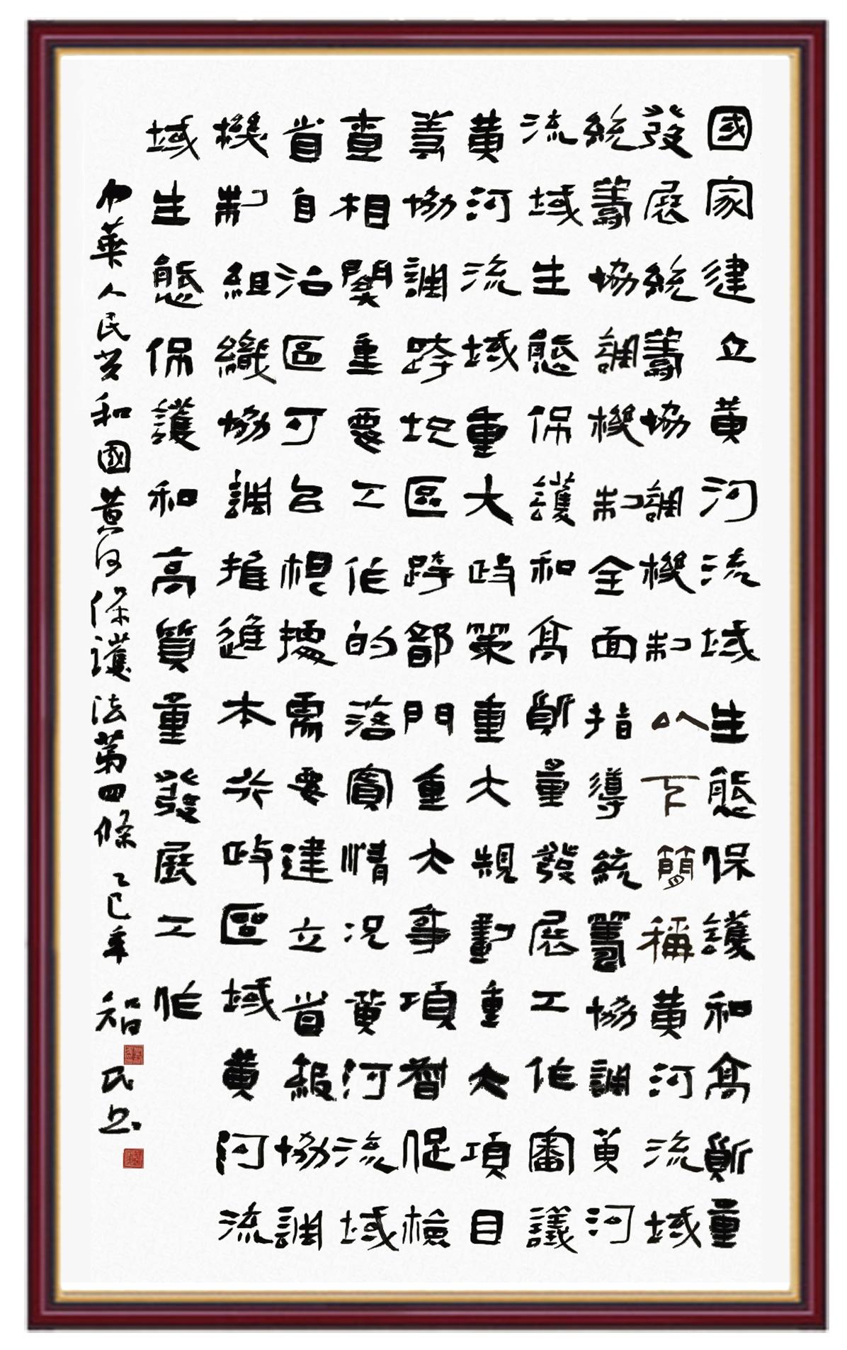 黃河寧,天下平。黃河是中華民族的發(fā)源地和搖籃,保護(hù)黃河是事關(guān)中華民族偉大復(fù)興的千秋大計(jì)?!吨腥A人民共和國(guó)黃河保護(hù)法》為推進(jìn)水資源節(jié)約集約利用、保護(hù)傳承弘揚(yáng)黃河文化、推動(dòng)黃河流域生態(tài)保護(hù)和高質(zhì)量發(fā)展提供了有力法治保障。繼書(shū)寫(xiě)《中華人民共和國(guó)民法典》《中華人民共和國(guó)憲法》《中華人民共和國(guó)澳門(mén)特別行政區(qū)基本法》《中華人民共和國(guó)香港特別行政區(qū)基本法》《中華人民共和國(guó)國(guó)旗法》《中華人民共和國(guó)國(guó)徽法》《中華人民共和國(guó)國(guó)歌法》《中華人民共和國(guó)法官法》等法律法規(guī)之后,法制日?qǐng)?bào)社聯(lián)合沿黃九省(區(qū))司法廳、書(shū)法家協(xié)會(huì),將筆端對(duì)準(zhǔn)《中華人民共和國(guó)黃河保護(hù)法》。