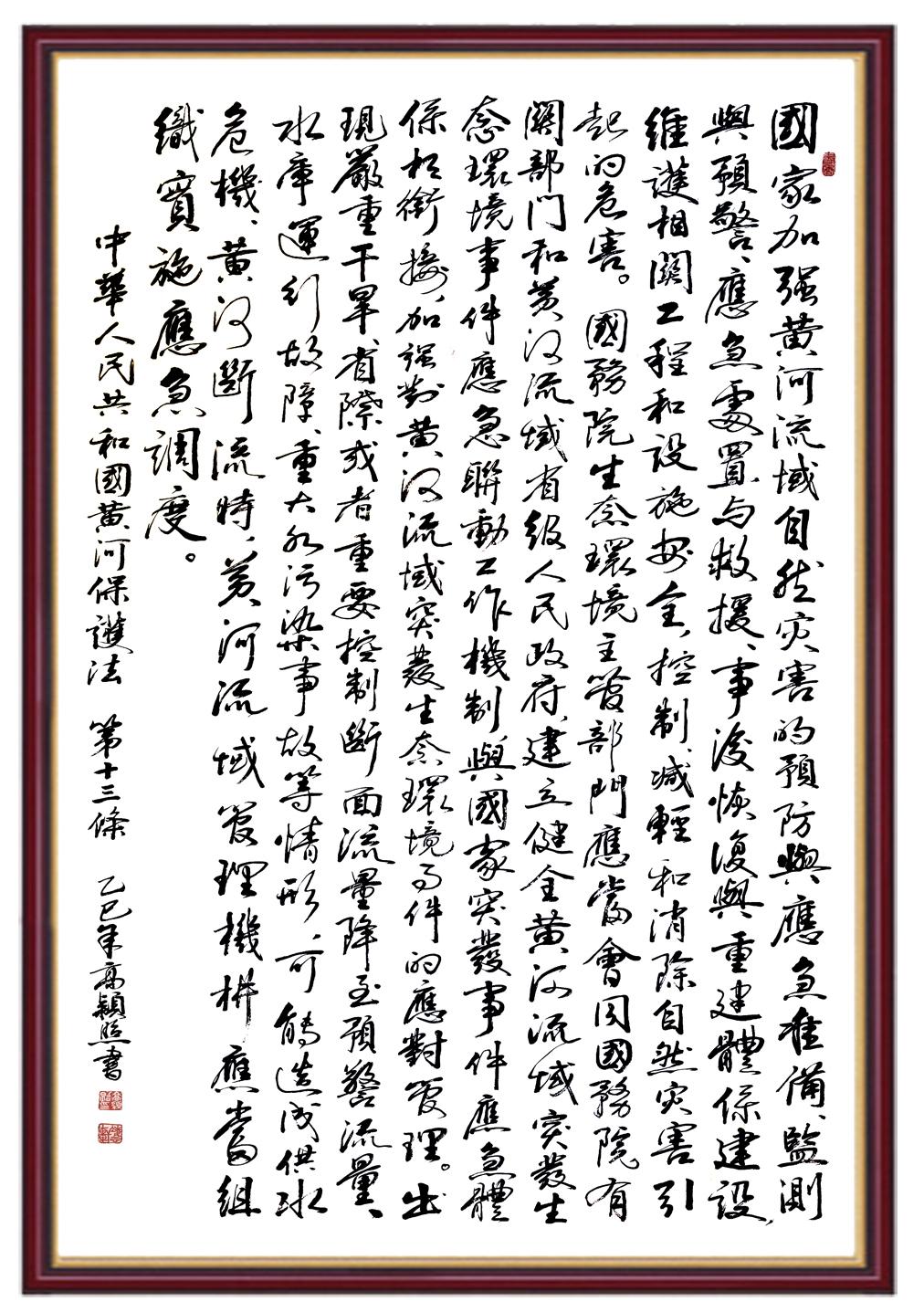 黃河寧,天下平。黃河是中華民族的發(fā)源地和搖籃,保護(hù)黃河是事關(guān)中華民族偉大復(fù)興的千秋大計?!吨腥A人民共和國黃河保護(hù)法》為推進(jìn)水資源節(jié)約集約利用、保護(hù)傳承弘揚黃河文化、推動黃河流域生態(tài)保護(hù)和高質(zhì)量發(fā)展提供了有力法治保障。繼書寫《中華人民共和國民法典》《中華人民共和國憲法》《中華人民共和國澳門特別行政區(qū)基本法》《中華人民共和國香港特別行政區(qū)基本法》《中華人民共和國國旗法》《中華人民共和國國徽法》《中華人民共和國國歌法》《中華人民共和國法官法》等法律法規(guī)之后,法制日報社聯(lián)合沿黃九省(區(qū))司法廳、書法家協(xié)會,將筆端對準(zhǔn)《中華人民共和國黃河保護(hù)法》。