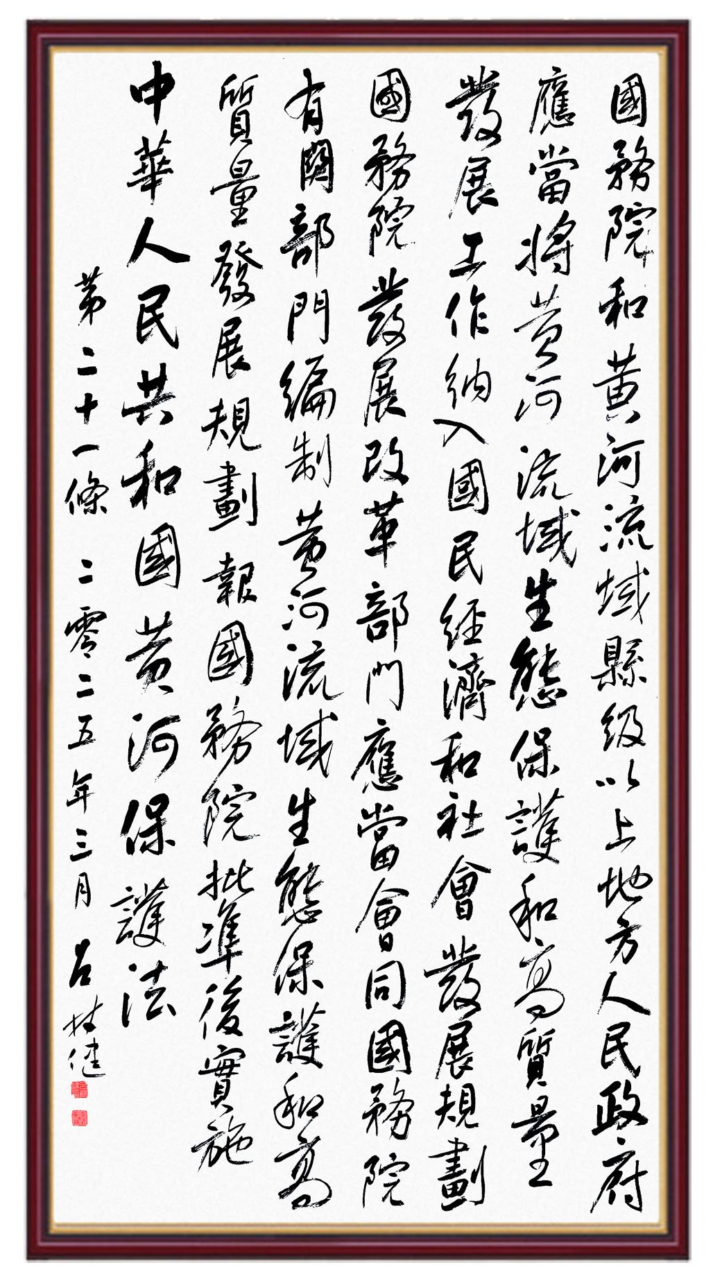 黃河寧,天下平。黃河是中華民族的發(fā)源地和搖籃,保護黃河是事關(guān)中華民族偉大復興的千秋大計?!吨腥A人民共和國黃河保護法》為推進水資源節(jié)約集約利用、保護傳承弘揚黃河文化、推動黃河流域生態(tài)保護和高質(zhì)量發(fā)展提供了有力法治保障。繼書寫《中華人民共和國民法典》《中華人民共和國憲法》《中華人民共和國澳門特別行政區(qū)基本法》《中華人民共和國香港特別行政區(qū)基本法》《中華人民共和國國旗法》《中華人民共和國國徽法》《中華人民共和國國歌法》《中華人民共和國法官法》等法律法規(guī)之后,法制日報社聯(lián)合沿黃九省(區(qū))司法廳、書法家協(xié)會,將筆端對準《中華人民共和國黃河保護法》。