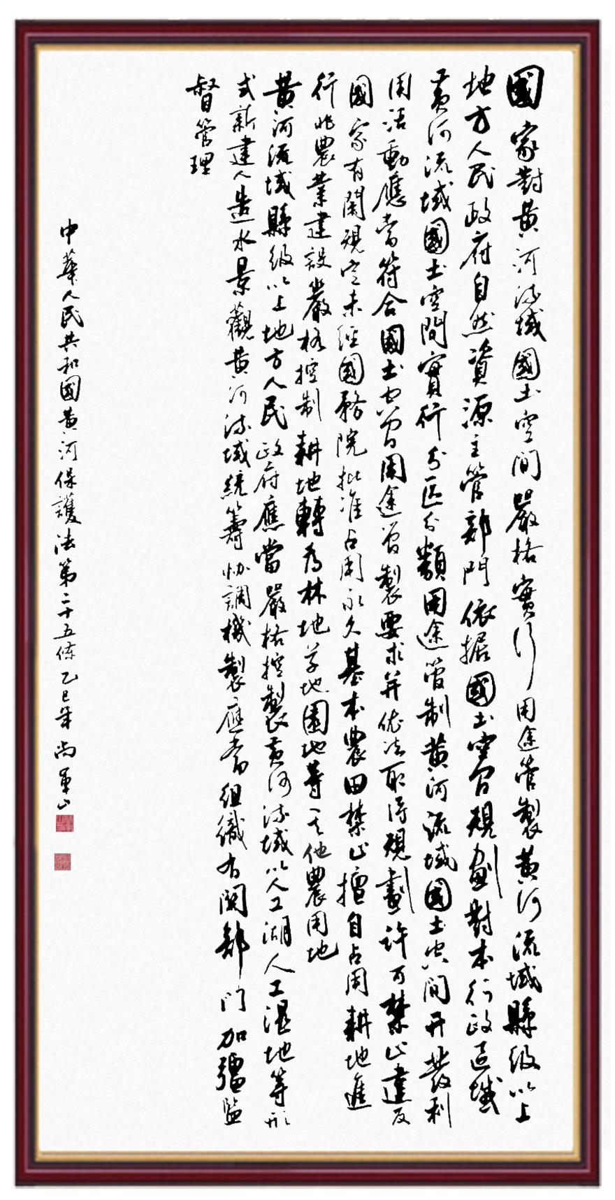 黃河寧,天下平。黃河是中華民族的發(fā)源地和搖籃,保護(hù)黃河是事關(guān)中華民族偉大復(fù)興的千秋大計(jì)?!吨腥A人民共和國黃河保護(hù)法》為推進(jìn)水資源節(jié)約集約利用、保護(hù)傳承弘揚(yáng)黃河文化、推動(dòng)黃河流域生態(tài)保護(hù)和高質(zhì)量發(fā)展提供了有力法治保障。繼書寫《中華人民共和國民法典》《中華人民共和國憲法》《中華人民共和國澳門特別行政區(qū)基本法》《中華人民共和國香港特別行政區(qū)基本法》《中華人民共和國國旗法》《中華人民共和國國徽法》《中華人民共和國國歌法》《中華人民共和國法官法》等法律法規(guī)之后,法制日報(bào)社聯(lián)合沿黃九?。▍^(qū))司法廳、書法家協(xié)會(huì),將筆端對準(zhǔn)《中華人民共和國黃河保護(hù)法》。