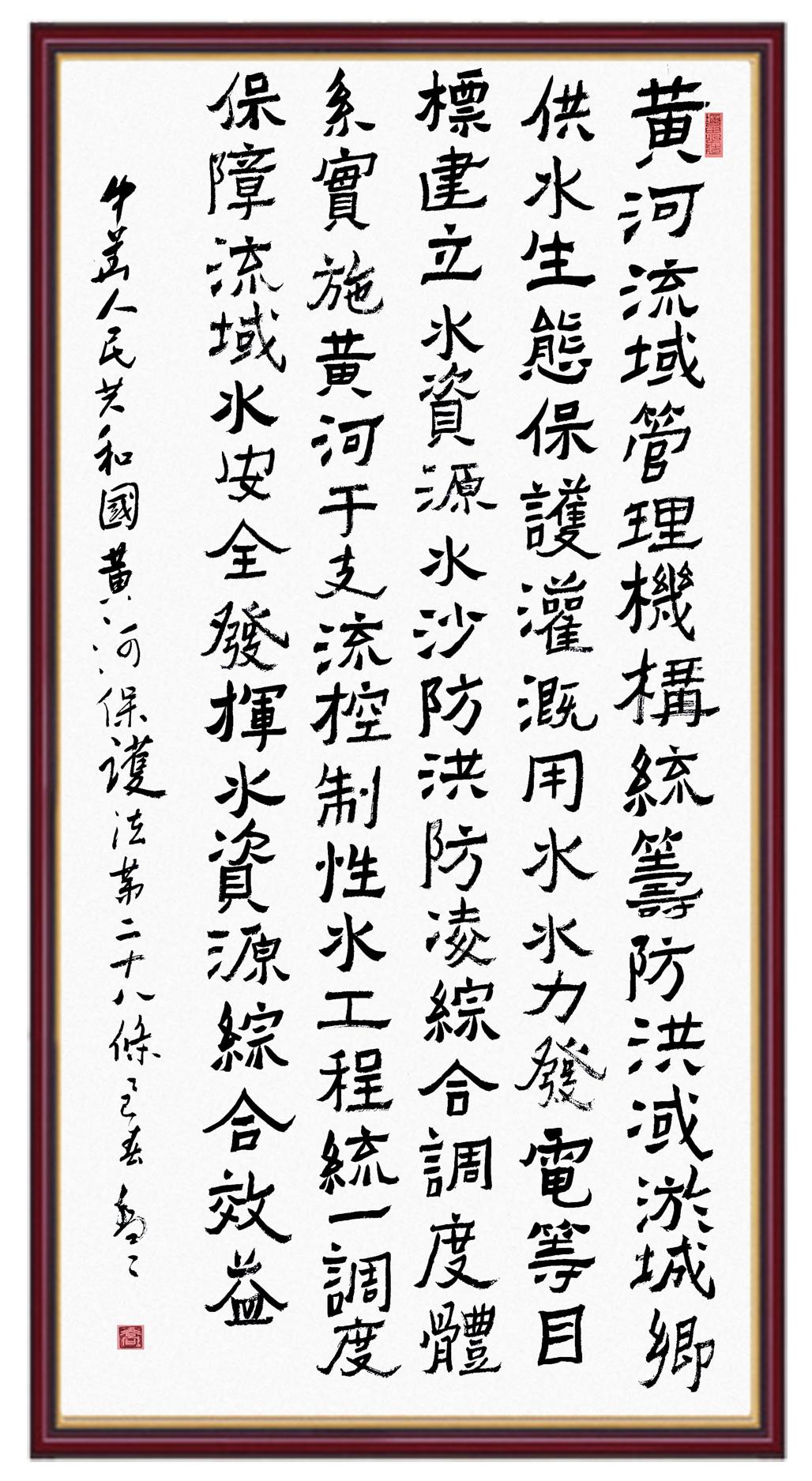 黃河寧,天下平。黃河是中華民族的發(fā)源地和搖籃,保護(hù)黃河是事關(guān)中華民族偉大復(fù)興的千秋大計(jì)?!吨腥A人民共和國黃河保護(hù)法》為推進(jìn)水資源節(jié)約集約利用、保護(hù)傳承弘揚(yáng)黃河文化、推動(dòng)黃河流域生態(tài)保護(hù)和高質(zhì)量發(fā)展提供了有力法治保障。繼書寫《中華人民共和國民法典》《中華人民共和國憲法》《中華人民共和國澳門特別行政區(qū)基本法》《中華人民共和國香港特別行政區(qū)基本法》《中華人民共和國國旗法》《中華人民共和國國徽法》《中華人民共和國國歌法》《中華人民共和國法官法》等法律法規(guī)之后,法制日?qǐng)?bào)社聯(lián)合沿黃九?。▍^(qū))司法廳、書法家協(xié)會(huì),將筆端對(duì)準(zhǔn)《中華人民共和國黃河保護(hù)法》。