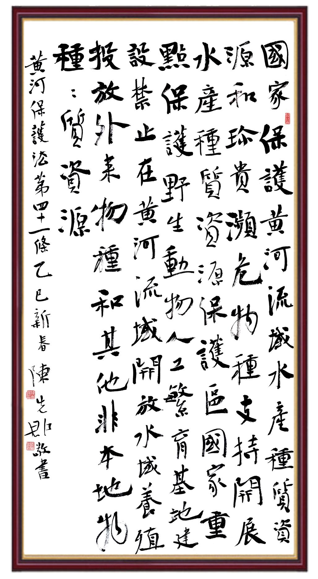 黃河寧,天下平。黃河是中華民族的發(fā)源地和搖籃,保護黃河是事關中華民族偉大復興的千秋大計?!吨腥A人民共和國黃河保護法》為推進水資源節(jié)約集約利用、保護傳承弘揚黃河文化、推動黃河流域生態(tài)保護和高質量發(fā)展提供了有力法治保障。繼書寫《中華人民共和國民法典》《中華人民共和國憲法》《中華人民共和國澳門特別行政區(qū)基本法》《中華人民共和國香港特別行政區(qū)基本法》《中華人民共和國國旗法》《中華人民共和國國徽法》《中華人民共和國國歌法》《中華人民共和國法官法》等法律法規(guī)之后,法制日報社聯(lián)合沿黃九?。▍^(qū))司法廳、書法家協(xié)會,將筆端對準《中華人民共和國黃河保護法》。