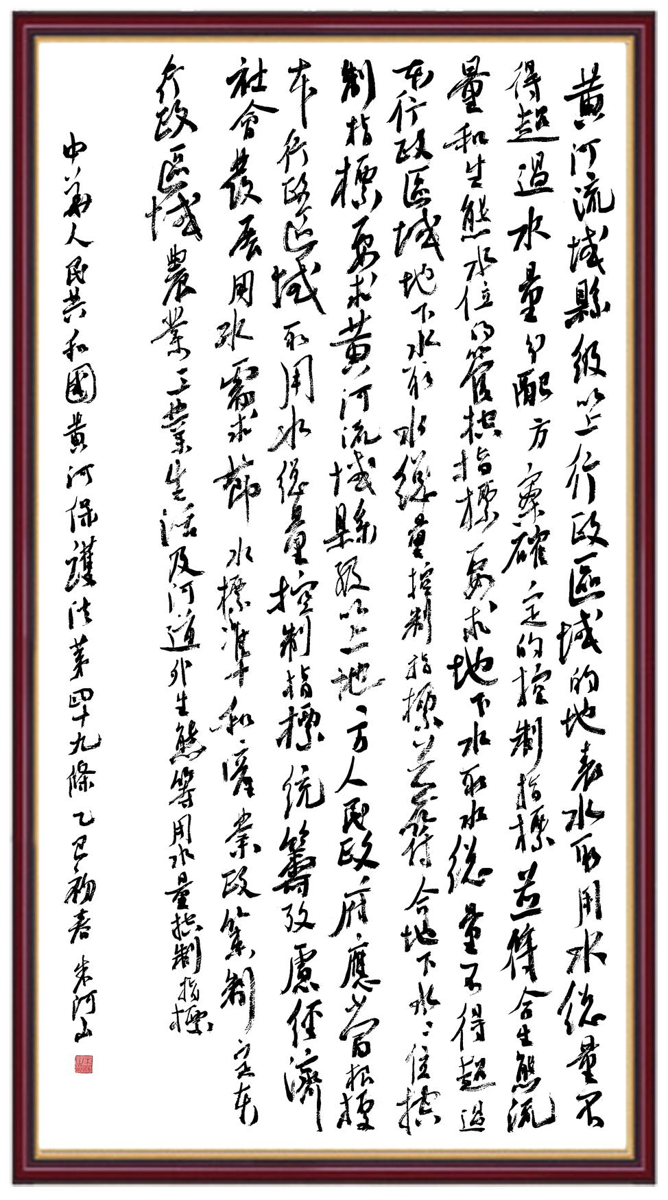 黃河寧,天下平。黃河是中華民族的發(fā)源地和搖籃,保護黃河是事關中華民族偉大復興的千秋大計?!吨腥A人民共和國黃河保護法》為推進水資源節(jié)約集約利用、保護傳承弘揚黃河文化、推動黃河流域生態(tài)保護和高質量發(fā)展提供了有力法治保障。繼書寫《中華人民共和國民法典》《中華人民共和國憲法》《中華人民共和國澳門特別行政區(qū)基本法》《中華人民共和國香港特別行政區(qū)基本法》《中華人民共和國國旗法》《中華人民共和國國徽法》《中華人民共和國國歌法》《中華人民共和國法官法》等法律法規(guī)之后,法制日報社聯(lián)合沿黃九?。▍^(qū))司法廳、書法家協(xié)會,將筆端對準《中華人民共和國黃河保護法》。