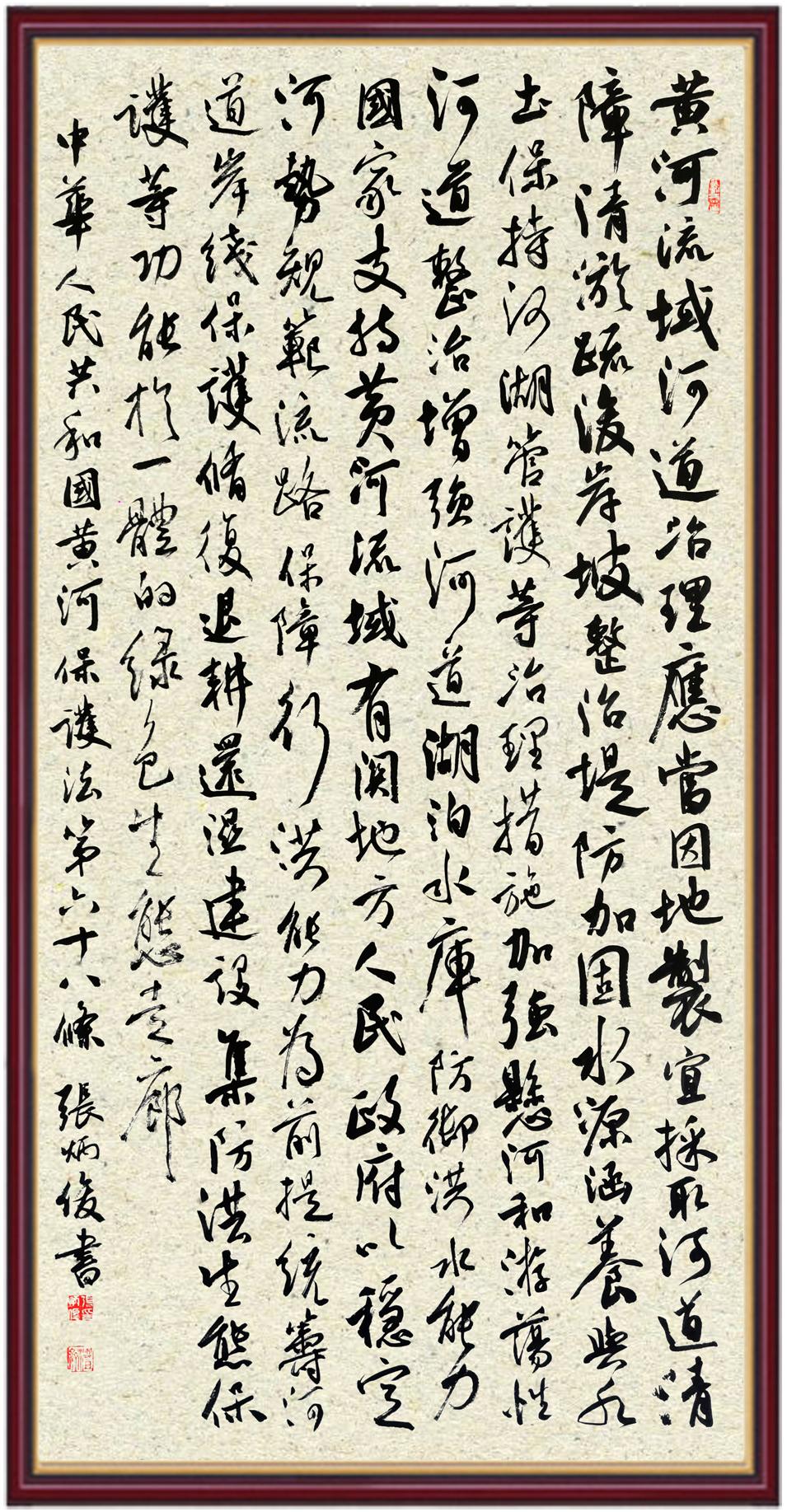 黃河寧,天下平。黃河是中華民族的發(fā)源地和搖籃,保護黃河是事關(guān)中華民族偉大復(fù)興的千秋大計。《中華人民共和國黃河保護法》為推進水資源節(jié)約集約利用、保護傳承弘揚黃河文化、推動黃河流域生態(tài)保護和高質(zhì)量發(fā)展提供了有力法治保障。繼書寫《中華人民共和國民法典》《中華人民共和國憲法》《中華人民共和國澳門特別行政區(qū)基本法》《中華人民共和國香港特別行政區(qū)基本法》《中華人民共和國國旗法》《中華人民共和國國徽法》《中華人民共和國國歌法》《中華人民共和國法官法》等法律法規(guī)之后,法制日報社聯(lián)合沿黃九?。▍^(qū))司法廳、書法家協(xié)會,將筆端對準(zhǔn)《中華人民共和國黃河保護法》。