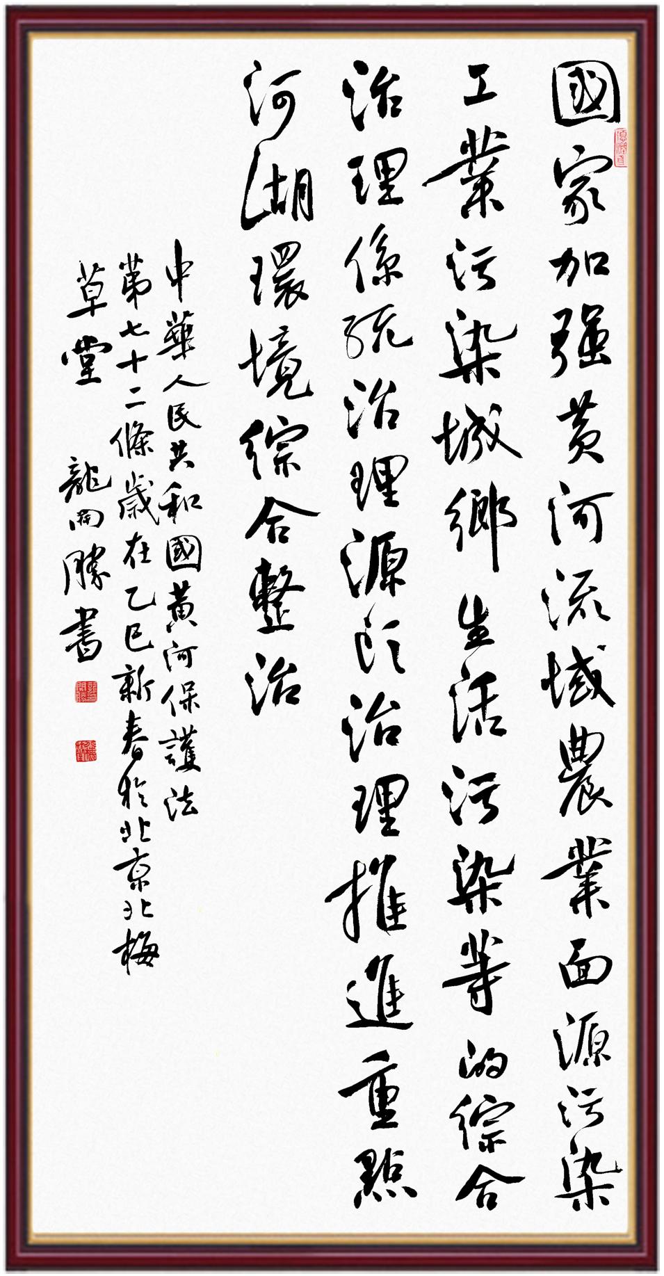 黃河寧,天下平。黃河是中華民族的發(fā)源地和搖籃,保護(hù)黃河是事關(guān)中華民族偉大復(fù)興的千秋大計(jì)?!吨腥A人民共和國黃河保護(hù)法》為推進(jìn)水資源節(jié)約集約利用、保護(hù)傳承弘揚(yáng)黃河文化、推動(dòng)黃河流域生態(tài)保護(hù)和高質(zhì)量發(fā)展提供了有力法治保障。繼書寫《中華人民共和國民法典》《中華人民共和國憲法》《中華人民共和國澳門特別行政區(qū)基本法》《中華人民共和國香港特別行政區(qū)基本法》《中華人民共和國國旗法》《中華人民共和國國徽法》《中華人民共和國國歌法》《中華人民共和國法官法》等法律法規(guī)之后,法制日?qǐng)?bào)社聯(lián)合沿黃九省(區(qū))司法廳、書法家協(xié)會(huì),將筆端對(duì)準(zhǔn)《中華人民共和國黃河保護(hù)法》。
