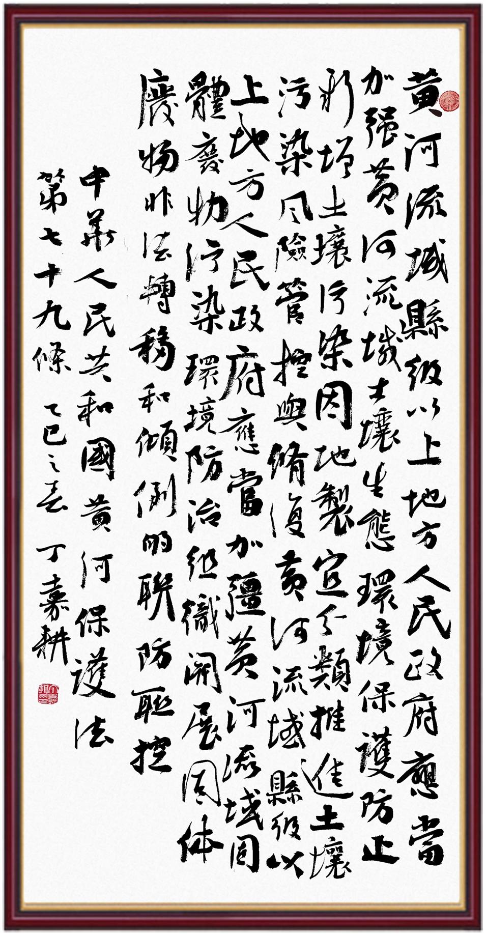 黃河寧,天下平。黃河是中華民族的發(fā)源地和搖籃,保護黃河是事關中華民族偉大復興的千秋大計?!吨腥A人民共和國黃河保護法》為推進水資源節(jié)約集約利用、保護傳承弘揚黃河文化、推動黃河流域生態(tài)保護和高質量發(fā)展提供了有力法治保障。繼書寫《中華人民共和國民法典》《中華人民共和國憲法》《中華人民共和國澳門特別行政區(qū)基本法》《中華人民共和國香港特別行政區(qū)基本法》《中華人民共和國國旗法》《中華人民共和國國徽法》《中華人民共和國國歌法》《中華人民共和國法官法》等法律法規(guī)之后,法制日報社聯(lián)合沿黃九?。▍^(qū))司法廳、書法家協(xié)會,將筆端對準《中華人民共和國黃河保護法》。