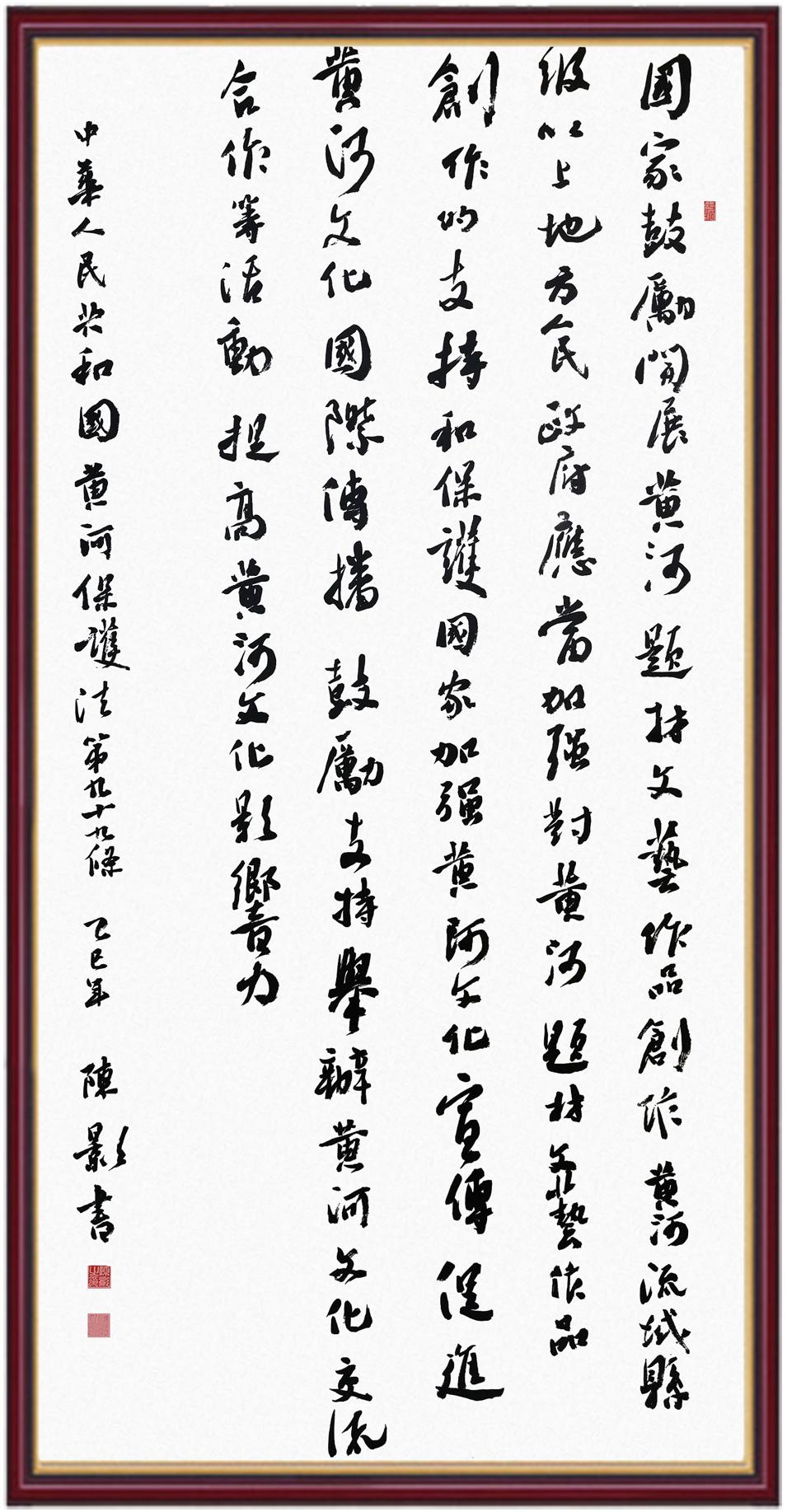 黃河寧,天下平。黃河是中華民族的發(fā)源地和搖籃,保護(hù)黃河是事關(guān)中華民族偉大復(fù)興的千秋大計?!吨腥A人民共和國黃河保護(hù)法》為推進(jìn)水資源節(jié)約集約利用、保護(hù)傳承弘揚黃河文化、推動黃河流域生態(tài)保護(hù)和高質(zhì)量發(fā)展提供了有力法治保障。繼書寫《中華人民共和國民法典》《中華人民共和國憲法》《中華人民共和國澳門特別行政區(qū)基本法》《中華人民共和國香港特別行政區(qū)基本法》《中華人民共和國國旗法》《中華人民共和國國徽法》《中華人民共和國國歌法》《中華人民共和國法官法》等法律法規(guī)之后,法制日報社聯(lián)合沿黃九?。▍^(qū))司法廳、書法家協(xié)會,將筆端對準(zhǔn)《中華人民共和國黃河保護(hù)法》。