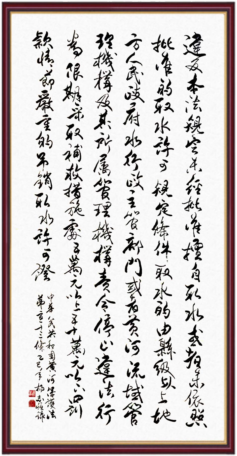 黃河寧,天下平。黃河是中華民族的發(fā)源地和搖籃,保護(hù)黃河是事關(guān)中華民族偉大復(fù)興的千秋大計(jì)?!吨腥A人民共和國黃河保護(hù)法》為推進(jìn)水資源節(jié)約集約利用、保護(hù)傳承弘揚(yáng)黃河文化、推動(dòng)黃河流域生態(tài)保護(hù)和高質(zhì)量發(fā)展提供了有力法治保障。繼書寫《中華人民共和國民法典》《中華人民共和國憲法》《中華人民共和國澳門特別行政區(qū)基本法》《中華人民共和國香港特別行政區(qū)基本法》《中華人民共和國國旗法》《中華人民共和國國徽法》《中華人民共和國國歌法》《中華人民共和國法官法》等法律法規(guī)之后,法制日報(bào)社聯(lián)合沿黃九?。▍^(qū))司法廳、書法家協(xié)會(huì),將筆端對準(zhǔn)《中華人民共和國黃河保護(hù)法》。