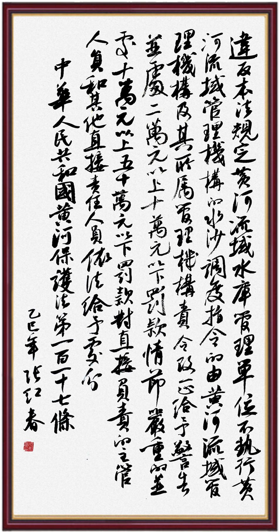 黃河寧,天下平。黃河是中華民族的發(fā)源地和搖籃,保護黃河是事關中華民族偉大復興的千秋大計?!吨腥A人民共和國黃河保護法》為推進水資源節(jié)約集約利用、保護傳承弘揚黃河文化、推動黃河流域生態(tài)保護和高質(zhì)量發(fā)展提供了有力法治保障。繼書寫《中華人民共和國民法典》《中華人民共和國憲法》《中華人民共和國澳門特別行政區(qū)基本法》《中華人民共和國香港特別行政區(qū)基本法》《中華人民共和國國旗法》《中華人民共和國國徽法》《中華人民共和國國歌法》《中華人民共和國法官法》等法律法規(guī)之后,法制日報社聯(lián)合沿黃九?。▍^(qū))司法廳、書法家協(xié)會,將筆端對準《中華人民共和國黃河保護法》。