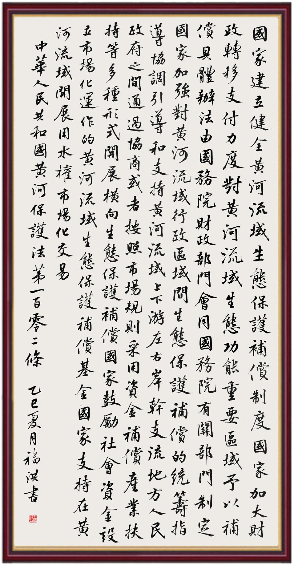 黃河寧,天下平。黃河是中華民族的發(fā)源地和搖籃,保護(hù)黃河是事關(guān)中華民族偉大復(fù)興的千秋大計(jì)?!吨腥A人民共和國(guó)黃河保護(hù)法》為推進(jìn)水資源節(jié)約集約利用、保護(hù)傳承弘揚(yáng)黃河文化、推動(dòng)黃河流域生態(tài)保護(hù)和高質(zhì)量發(fā)展提供了有力法治保障。繼書寫《中華人民共和國(guó)民法典》《中華人民共和國(guó)憲法》《中華人民共和國(guó)澳門特別行政區(qū)基本法》《中華人民共和國(guó)香港特別行政區(qū)基本法》《中華人民共和國(guó)國(guó)旗法》《中華人民共和國(guó)國(guó)徽法》《中華人民共和國(guó)國(guó)歌法》《中華人民共和國(guó)法官法》等法律法規(guī)之后,法制日?qǐng)?bào)社聯(lián)合沿黃九?。▍^(qū))司法廳、書法家協(xié)會(huì),將筆端對(duì)準(zhǔn)《中華人民共和國(guó)黃河保護(hù)法》。