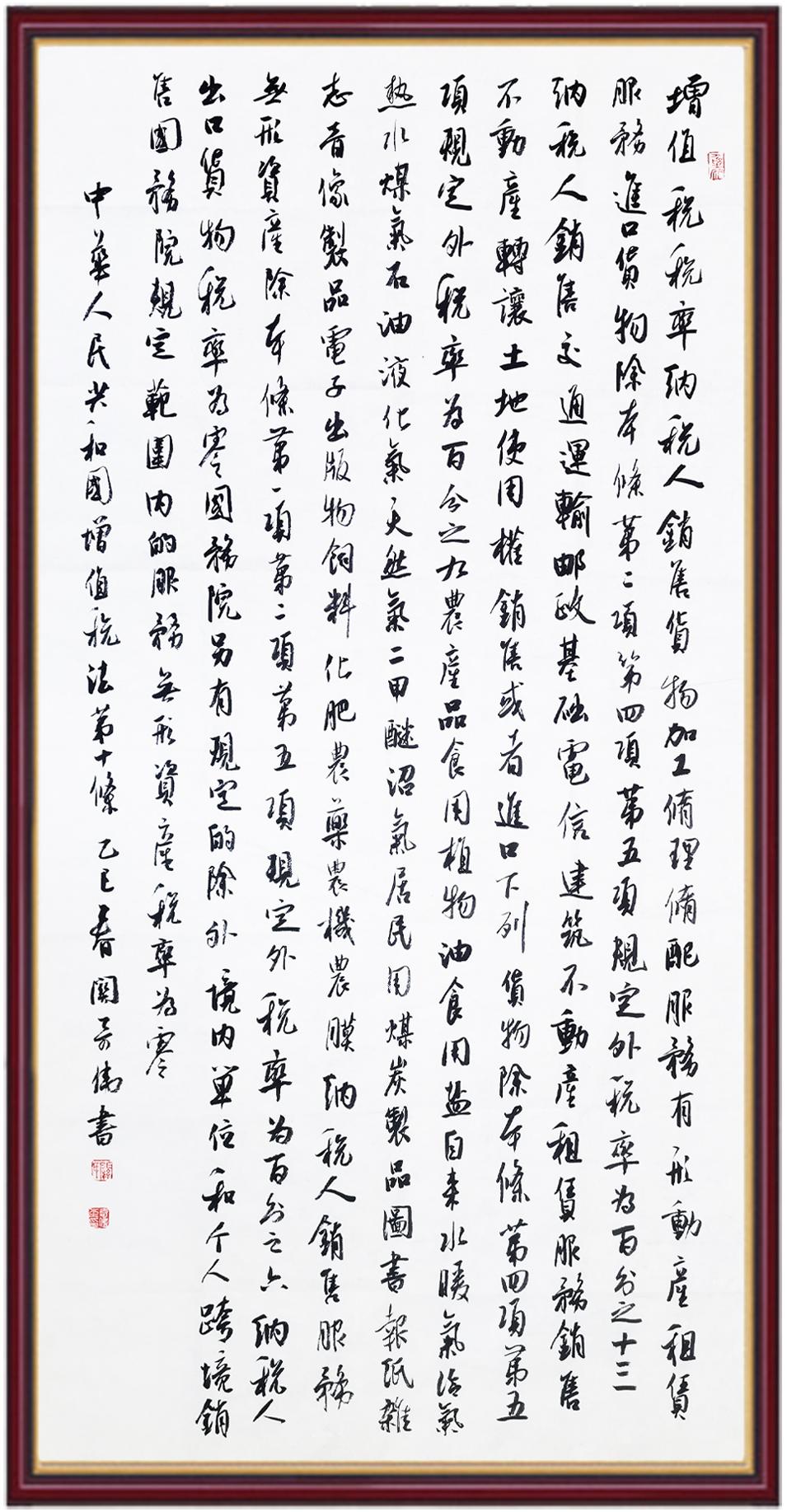 稅收一頭連著國(guó)計(jì),一頭連著民生。全面推進(jìn)依法治稅,是全面依法治國(guó)基本方略在稅收領(lǐng)域的集中體現(xiàn)?!吨腥A人民共和國(guó)增值稅法》將于2026年1月1日起施行,對(duì)全面落實(shí)稅收法定原則、健全有利于高質(zhì)量發(fā)展的增值稅制度、規(guī)范增值稅的征收和繳納、保護(hù)納稅人合法權(quán)益具有重要意義。繼書(shū)寫(xiě)《中華人民共和國(guó)民法典》《中華人民共和國(guó)憲法》《中華人民共和國(guó)國(guó)旗法》《中華人民共和國(guó)國(guó)徽法》《中華人民共和國(guó)國(guó)歌法》《中華人民共和國(guó)法官法》《中華人民共和國(guó)黃河保護(hù)法》等法律法規(guī)之后,法制日?qǐng)?bào)社將筆端對(duì)準(zhǔn)《中華人民共和國(guó)增值稅法》。