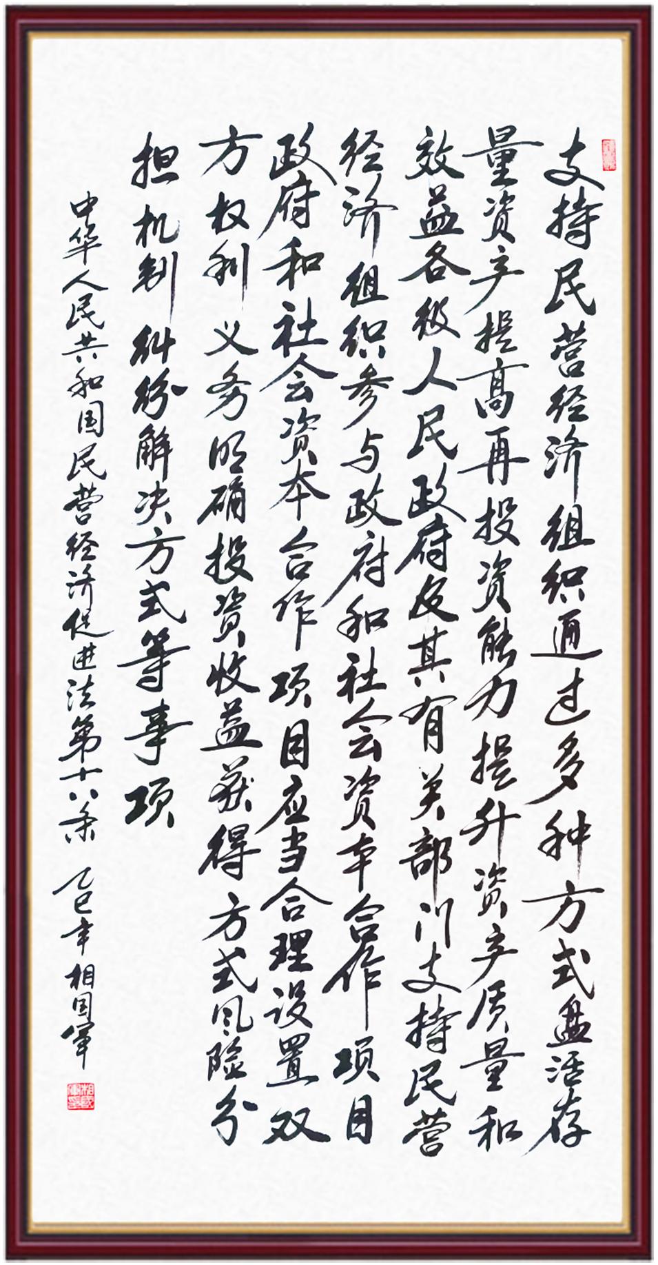 《中華人民共和國(guó)民營(yíng)經(jīng)濟(jì)促進(jìn)法》自今年5月20日起施行。作為我國(guó)首部專門關(guān)于民營(yíng)經(jīng)濟(jì)發(fā)展的基礎(chǔ)性法律,民營(yíng)經(jīng)濟(jì)促進(jìn)法將支持和保障民營(yíng)經(jīng)濟(jì)發(fā)展的法律制度融入中國(guó)特色社會(huì)主義法律體系,具有重大的法治意義,為促進(jìn)民營(yíng)經(jīng)濟(jì)持續(xù)、健康、高質(zhì)量發(fā)展提供了堅(jiān)實(shí)的法治保障。為更好地學(xué)習(xí)、宣傳、貫徹這部法律,法治日?qǐng)?bào)社聯(lián)合司法部普法與依法治理局,開展“‘書·法’系列活動(dòng)之書寫《中華人民共和國(guó)民營(yíng)經(jīng)濟(jì)促進(jìn)法》”活動(dòng)。