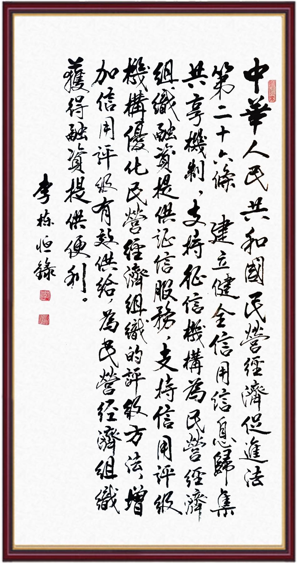 《中華人民共和國民營經(jīng)濟(jì)促進(jìn)法》自今年5月20日起施行。作為我國首部專門關(guān)于民營經(jīng)濟(jì)發(fā)展的基礎(chǔ)性法律,民營經(jīng)濟(jì)促進(jìn)法將支持和保障民營經(jīng)濟(jì)發(fā)展的法律制度融入中國特色社會主義法律體系,具有重大的法治意義,為促進(jìn)民營經(jīng)濟(jì)持續(xù)、健康、高質(zhì)量發(fā)展提供了堅實的法治保障。為更好地學(xué)習(xí)、宣傳、貫徹這部法律,法治日報社聯(lián)合司法部普法與依法治理局,開展“‘書·法’系列活動之書寫《中華人民共和國民營經(jīng)濟(jì)促進(jìn)法》”活動。