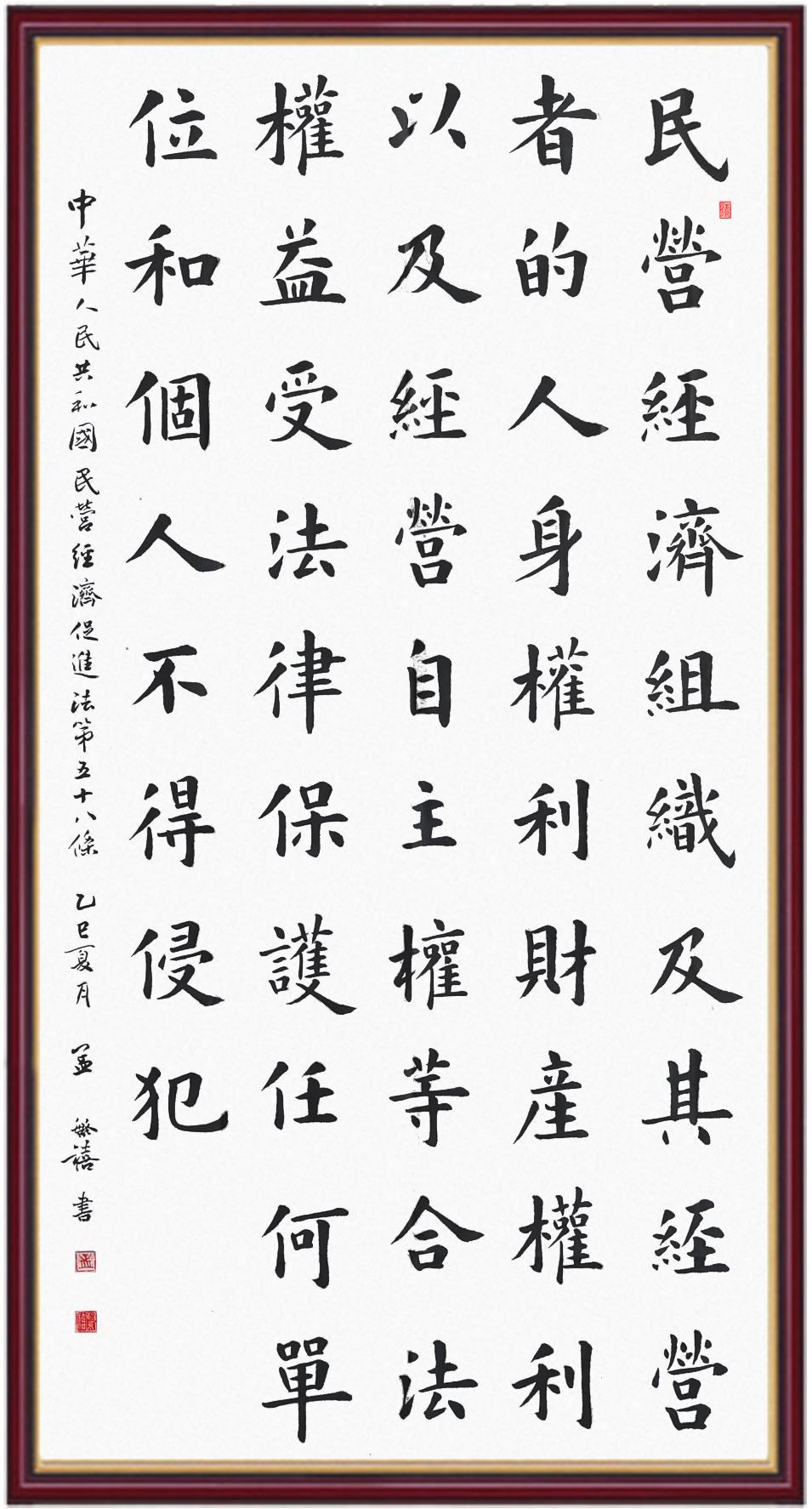 《中華人民共和國民營經(jīng)濟促進法》自今年5月20日起施行。作為我國首部專門關于民營經(jīng)濟發(fā)展的基礎性法律,民營經(jīng)濟促進法將支持和保障民營經(jīng)濟發(fā)展的法律制度融入中國特色社會主義法律體系,具有重大的法治意義,為促進民營經(jīng)濟持續(xù)、健康、高質(zhì)量發(fā)展提供了堅實的法治保障。為更好地學習、宣傳、貫徹這部法律,法治日報社聯(lián)合司法部普法與依法治理局,開展“‘書·法’系列活動之書寫《中華人民共和國民營經(jīng)濟促進法》”活動。