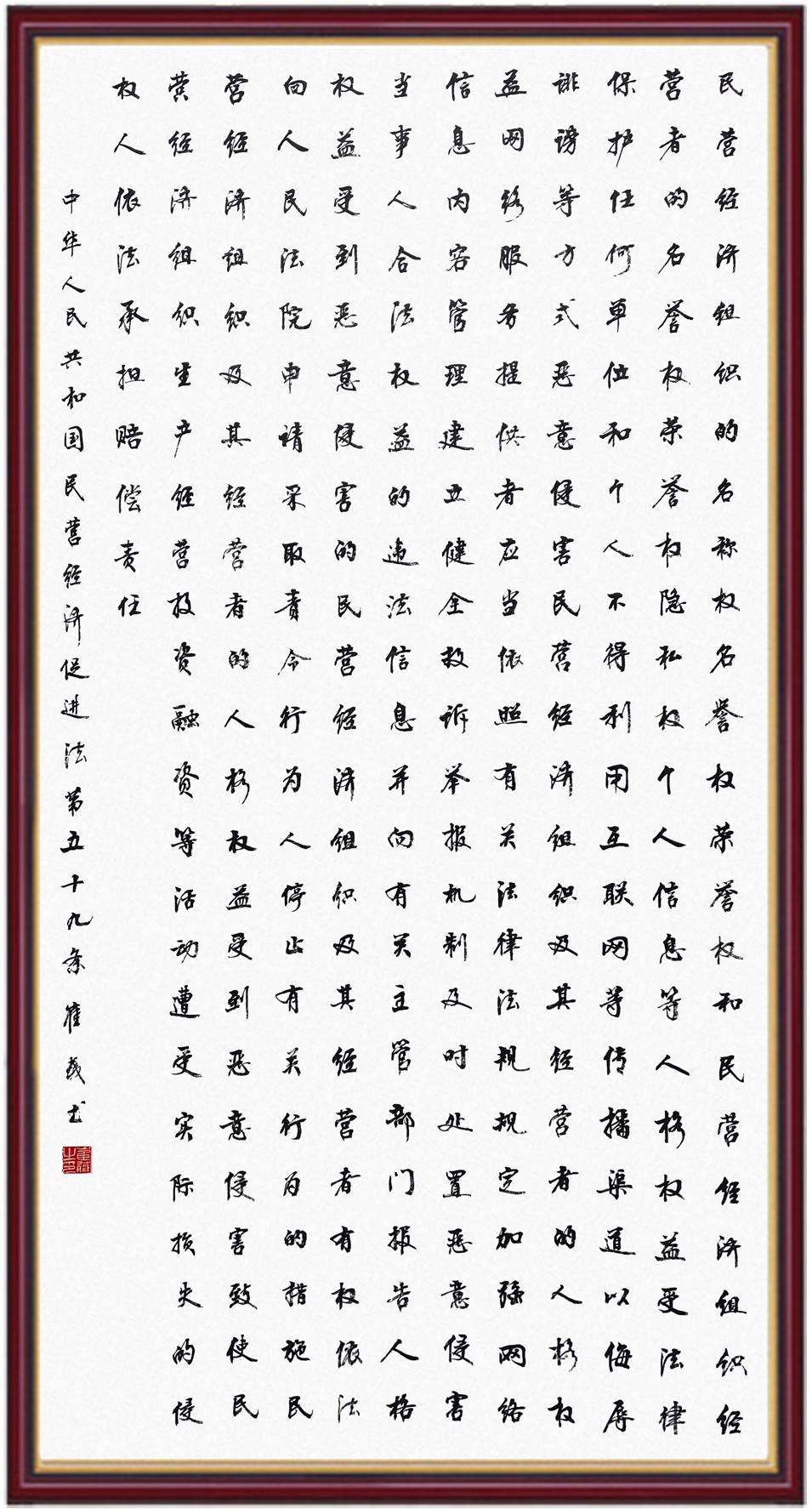 《中華人民共和國民營經(jīng)濟(jì)促進(jìn)法》自今年5月20日起施行。作為我國首部專門關(guān)于民營經(jīng)濟(jì)發(fā)展的基礎(chǔ)性法律,民營經(jīng)濟(jì)促進(jìn)法將支持和保障民營經(jīng)濟(jì)發(fā)展的法律制度融入中國特色社會(huì)主義法律體系,具有重大的法治意義,為促進(jìn)民營經(jīng)濟(jì)持續(xù)、健康、高質(zhì)量發(fā)展提供了堅(jiān)實(shí)的法治保障。為更好地學(xué)習(xí)、宣傳、貫徹這部法律,法治日報(bào)社聯(lián)合司法部普法與依法治理局,開展“‘書·法’系列活動(dòng)之書寫《中華人民共和國民營經(jīng)濟(jì)促進(jìn)法》”活動(dòng)。