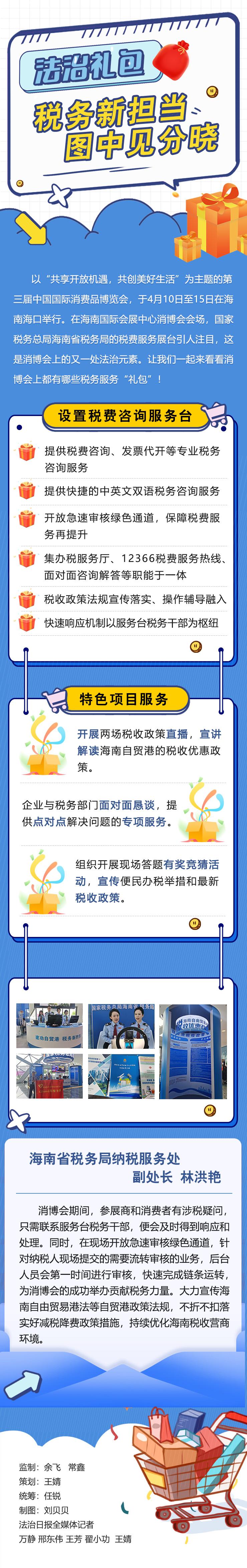 以“共享開(kāi)放機(jī)遇,共創(chuàng)美好生活”為主題的第三屆中國(guó)國(guó)際消費(fèi)品博覽會(huì),于4月10日至15日在海南??谂e行。進(jìn)入會(huì)場(chǎng)海南國(guó)際會(huì)展中心登錄大廳,國(guó)家稅務(wù)總局海南省稅務(wù)局的稅費(fèi)服務(wù)展臺(tái)引人注目,這是消博會(huì)上的又一處法治元素。讓我們一起來(lái)看看消博會(huì)上都有哪些稅務(wù)服務(wù)“禮包”!